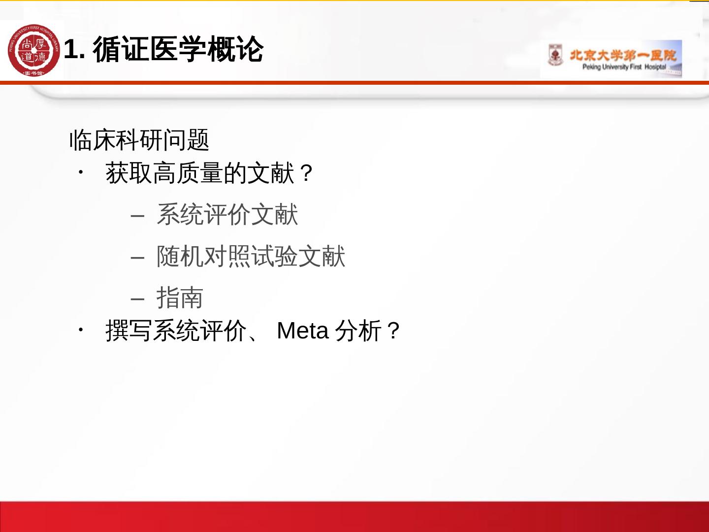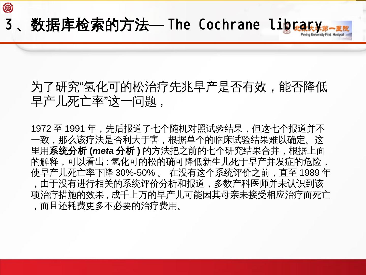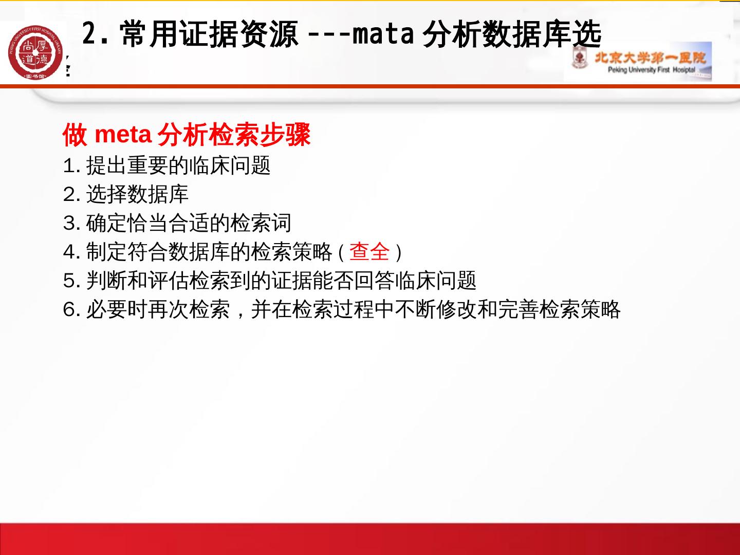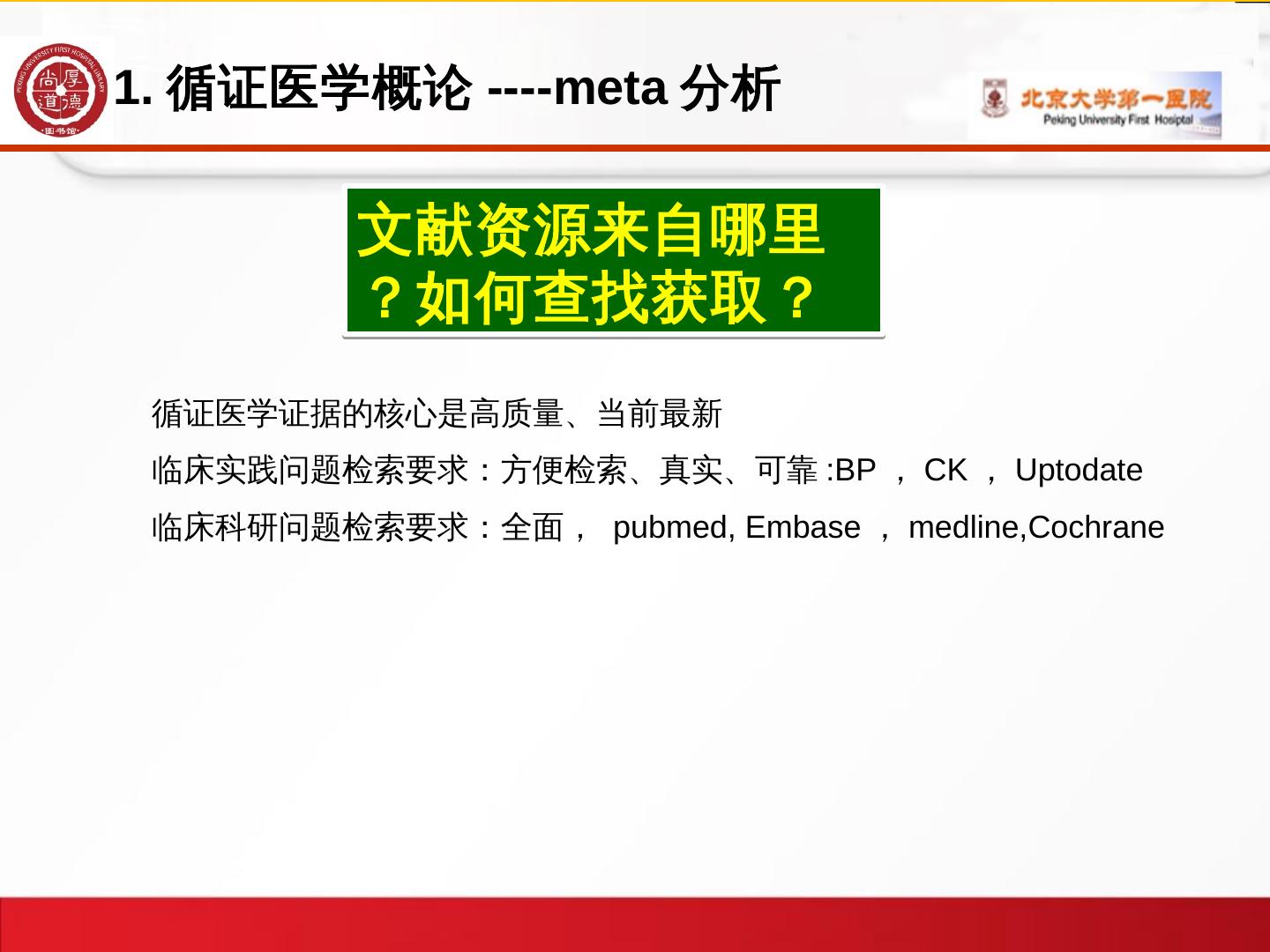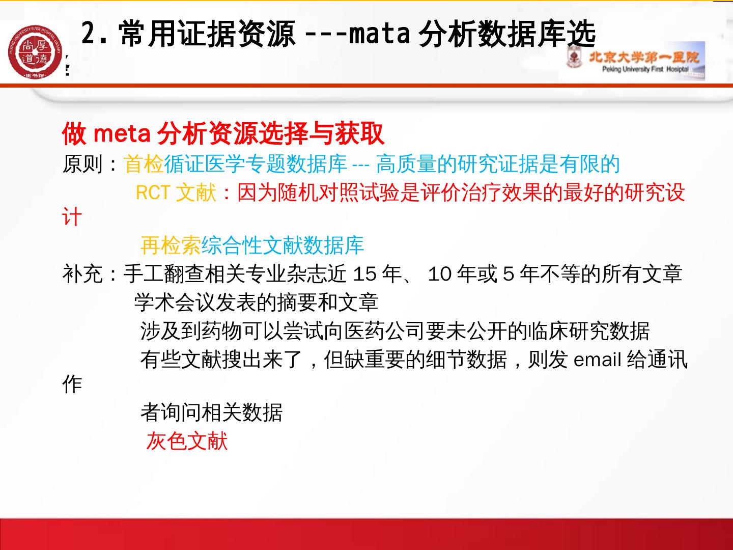 1、循证医学概论; 2、常用证据资源/meta分析资源的选择; 3、数据库检索的方法. -常用数据库介绍 ... Meta分析是对以往的研究结果进行系统定量综合的统计学方法。