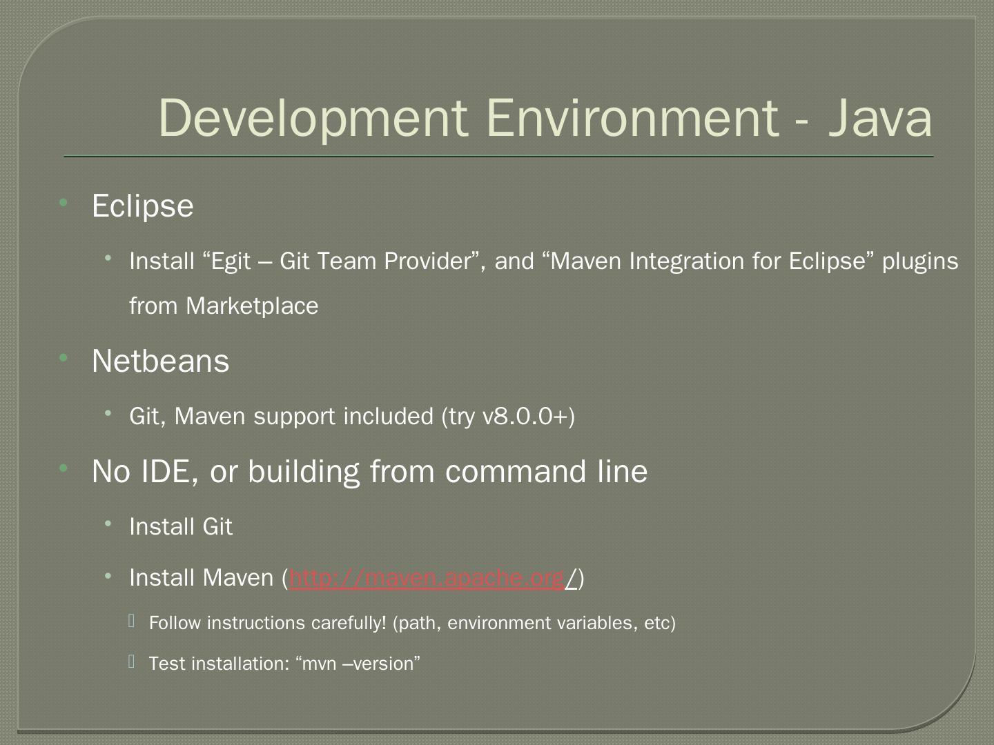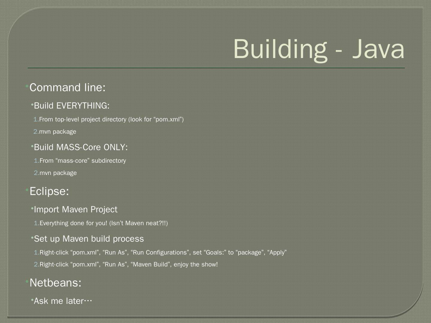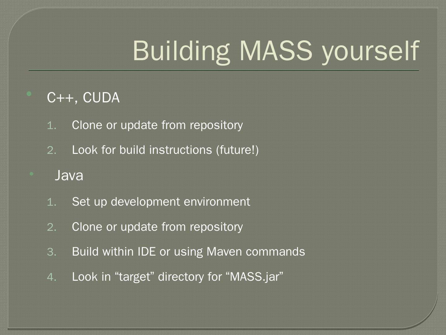 Set up development environment; Clone or update from repository; Build within IDE or using Maven commands; Look in “target” directory for “MASS.jar”.