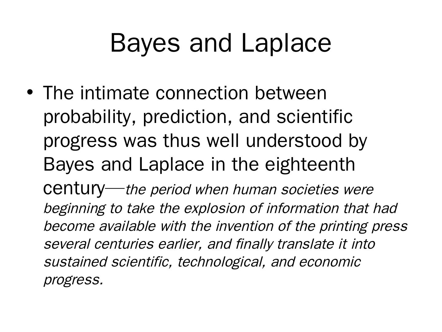 3 .Bayes and Laplace The intimate connection between probability, prediction, and scientific progress was thus well understood by Bayes and Laplace in the eighteenth century— the period when human societies were beginning to take the explosion of information that had become available with the invention of the printing press several centuries earlier, and finally translate it into sustained scientific, technological, and economic progress.