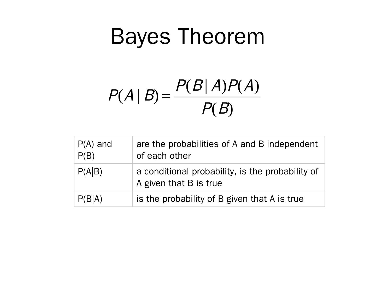 5 .Bayes Theorem P(A) and P(B) are the probabilities of A and B independent of each other P(A|B) a conditional probability, is the probability of A given that B is true P(B|A) is the probability of B given that A is true