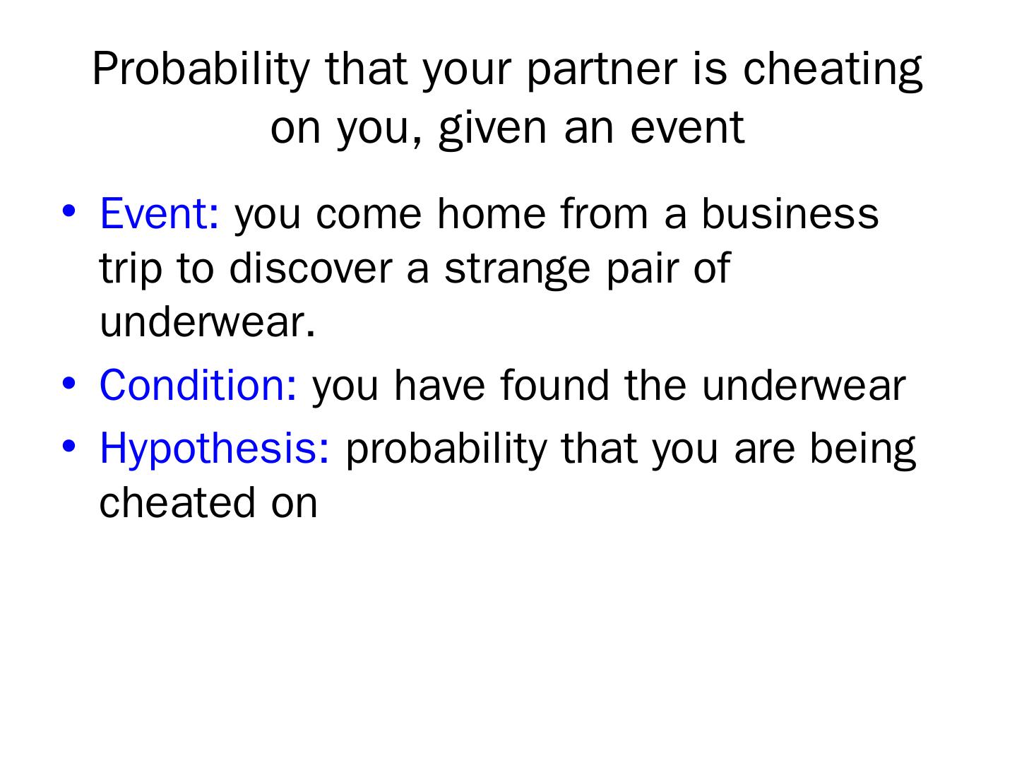 7 .Probability that your partner is cheating on you, given an event Event: you come home from a business trip to discover a strange pair of underwear. Condition: you have found the underwear Hypothesis: probability that you are being cheated on