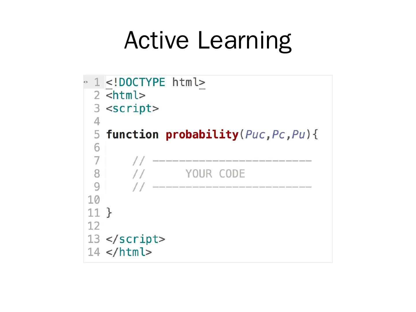 13 .Active Learning – Calculate Cheating Probability T he probability of cheating c given underwear u The probability of underwear u given cheating c 50 The probability of the cheating c 4 The probability of the underwear u appearing if NO cheating 5