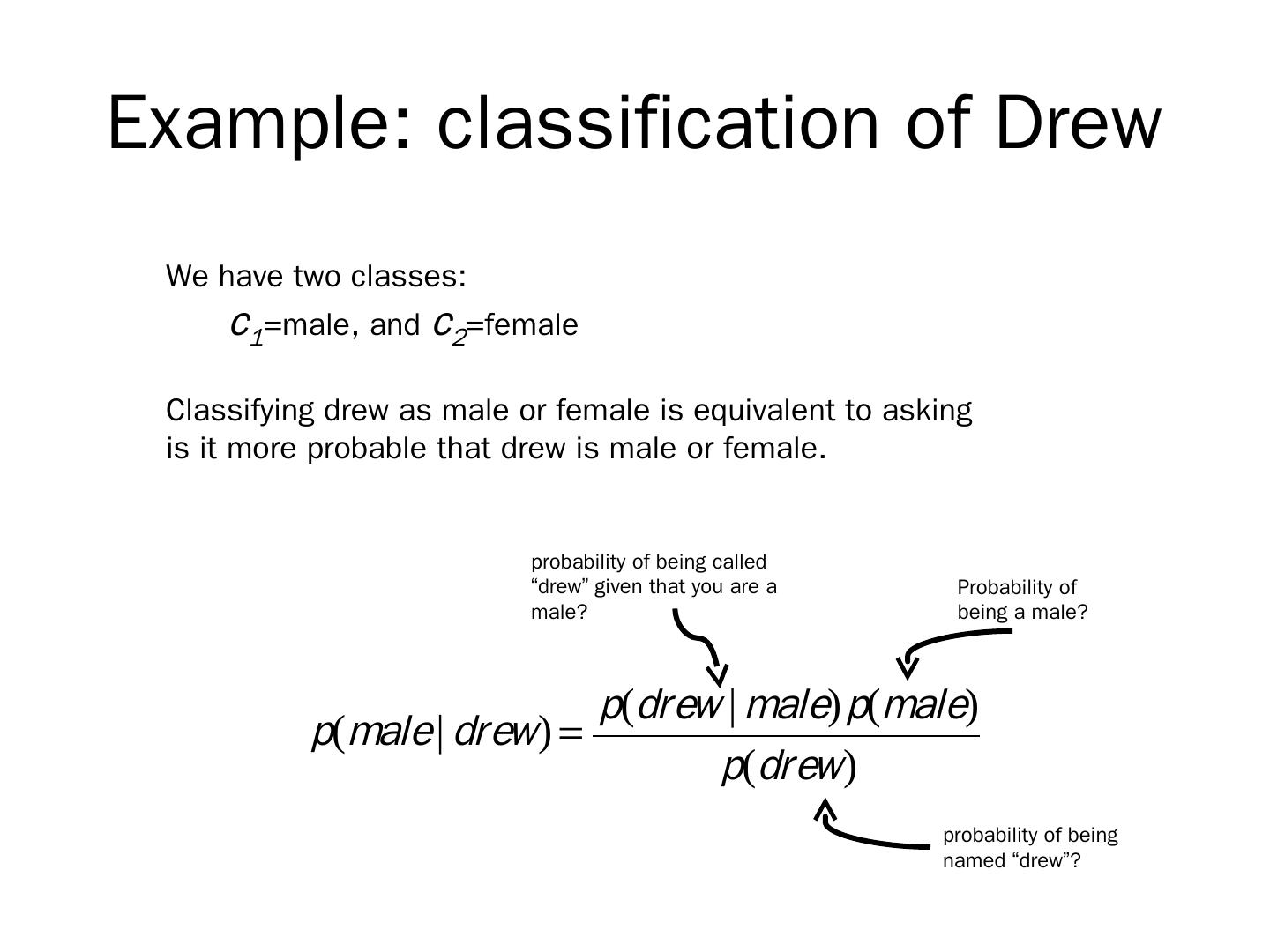 15 .Example: classification of Drew We have two classes: c 1 =male, and c 2 =female Classifying drew as male or female is equivalent to asking is it more probable that drew is male or female. probability of being called “drew” given that you are a male? Probability of being a male? probability of being named “drew”?