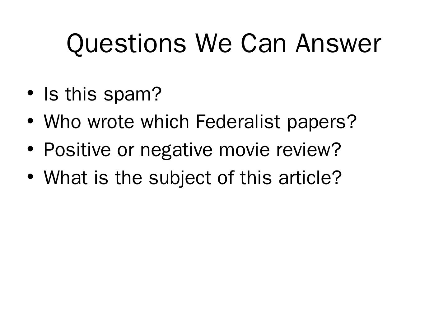 19 .Questions We Can Answer Is this spam? Who wrote which Federalist papers ? Positive or negative movie review ? What is the subject of this article?