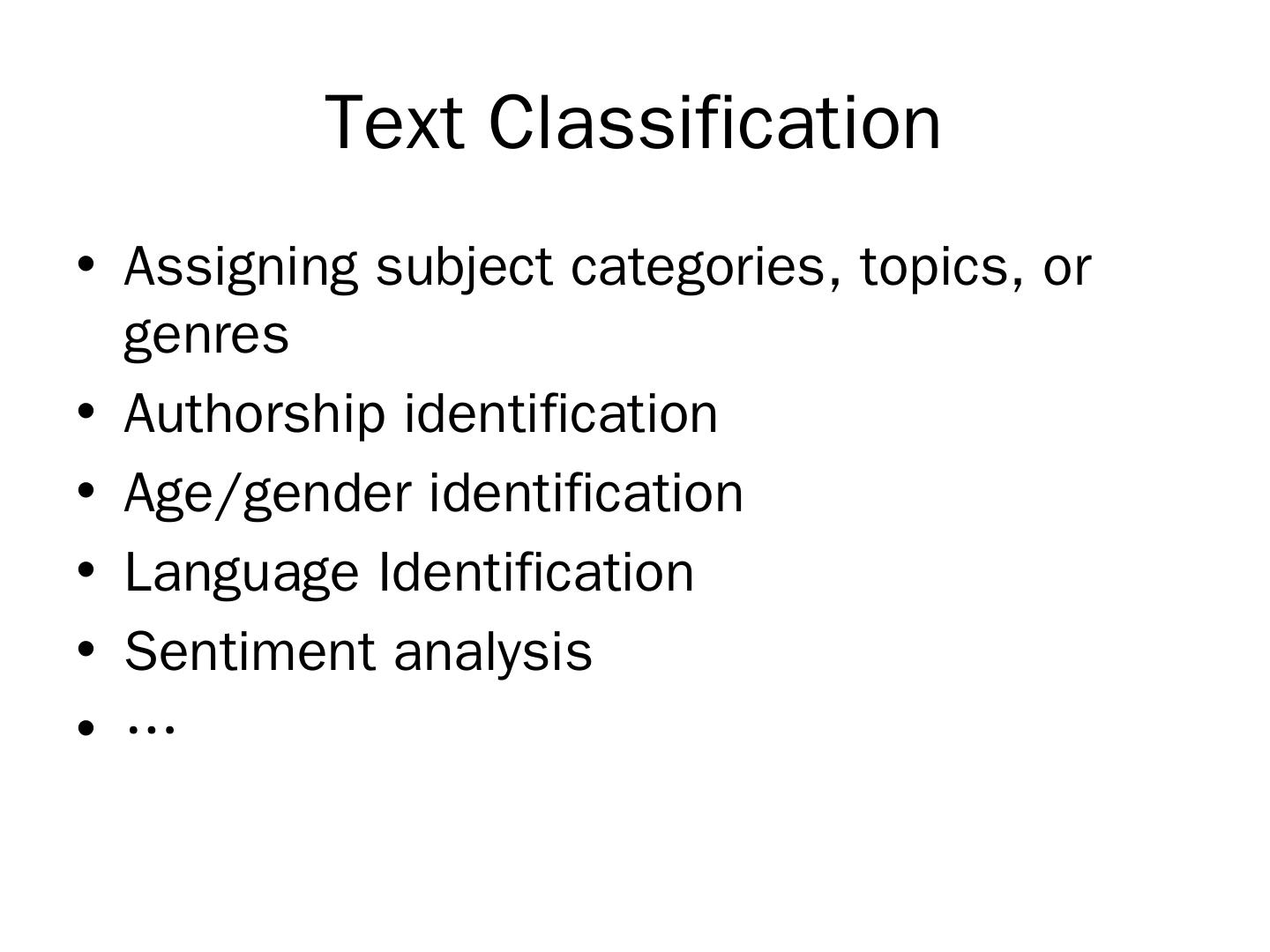 20 .Text Classification Assigning subject categories, topics, or genres Authorship identification Age/gender identification Language Identification Sentiment analysis …