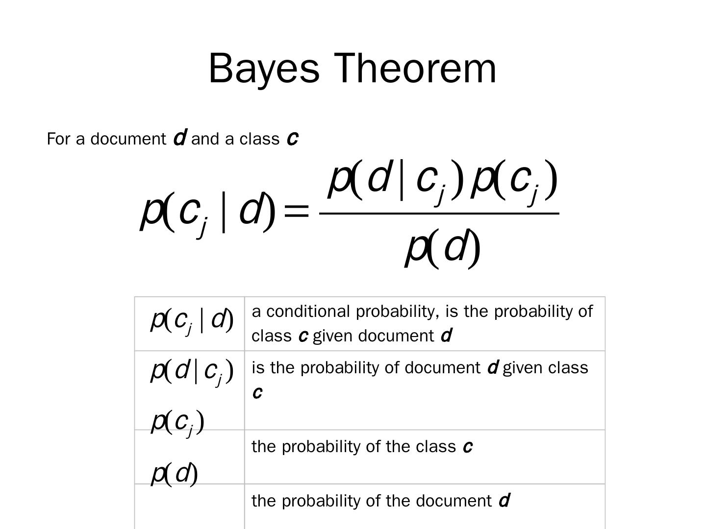 21 .Bayes Theorem a conditional probability, is the probability of class c given document d is the probability of document d given class c the probability of the class c the probability of the document d For a document d and a class c