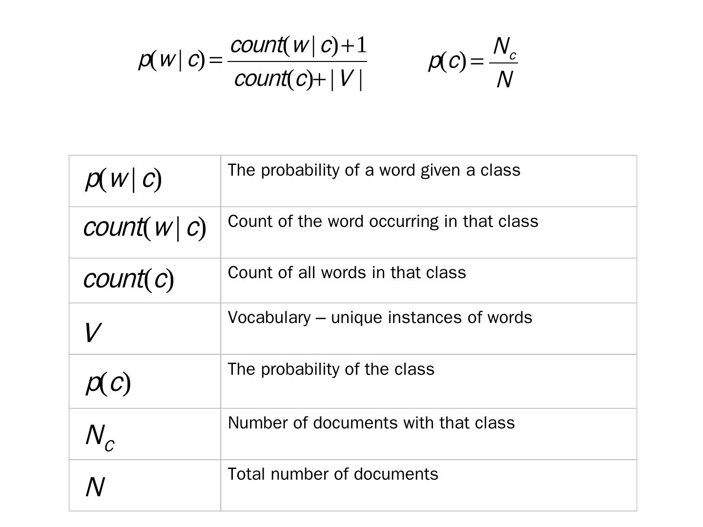 22 .The probability of a word given a class Count of the word occurring in that class Count of all words in that class Vocabulary – unique instances of words The probability of the class Number of documents with that class Total number of documents