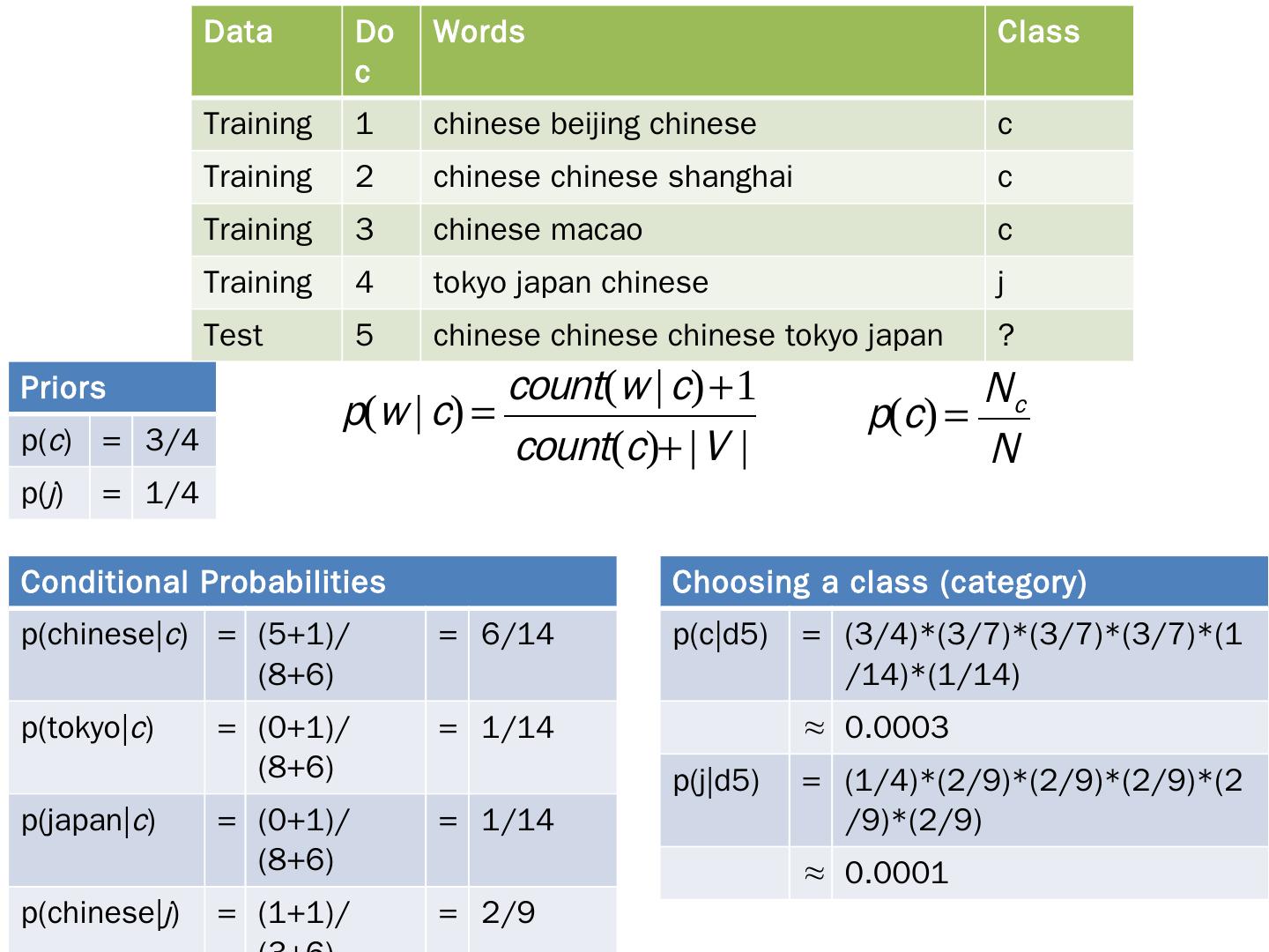 23 .Data Doc Words Class Training 1 chinese beijing chinese c Training 2 chinese chinese shanghai c Training 3 chinese macao c Training 4 tokyo japan chinese j Test 5 chinese chinese chinese tokyo japan ? Conditional Probabilities p(chinese| c ) = (5+1)/(8+6) = 6/14 p(tokyo| c ) = (0+1)/(8+6) = 1/14 p(japan| c ) = (0+1)/(8+6) = 1/14 p(chinese| j ) = (1+1)/(3+6) = 2/9 p(tokyo| j ) = (1+1)/(3+6) = 2/9 p(japan| j ) = (1+1)/(3+6) = 2/9 Priors p( c ) = 3/4 p( j ) = 1/4 Choosing a class (category) p(c| d5 ) = (3/4)*(3/7)*(3/7)*(3/7)*(1/14)*(1/14) ≈ 0.0003 p(j| d5 ) = (1/4)*(2/9)*(2/9)*(2/9)*(2/9)*(2/9) ≈ 0.0001