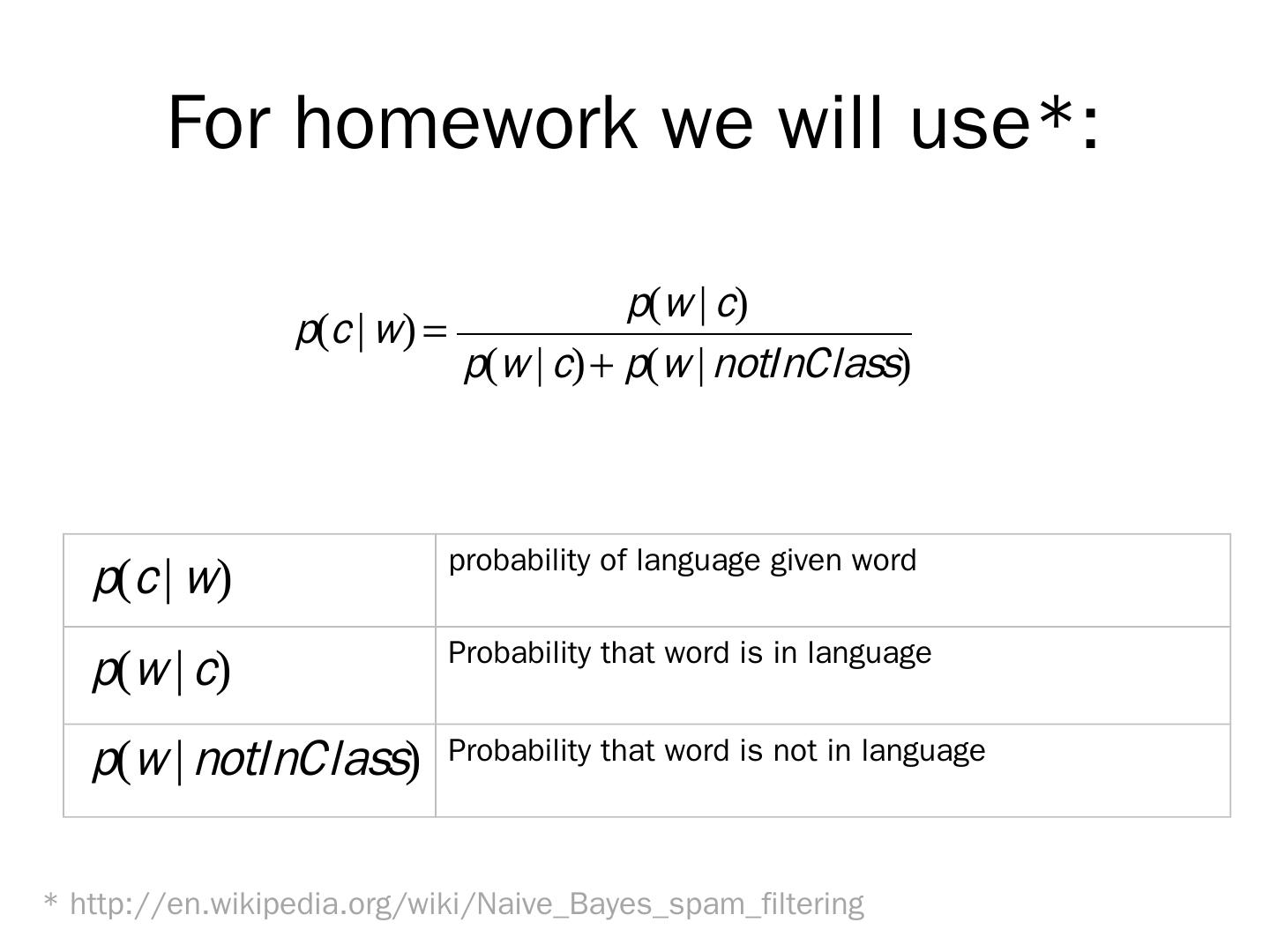 24 .For homework we will use*: probability of language given word Probability that word is in language Probability that word is not in language * http://en.wikipedia.org/wiki/Naive_Bayes_spam_filtering
