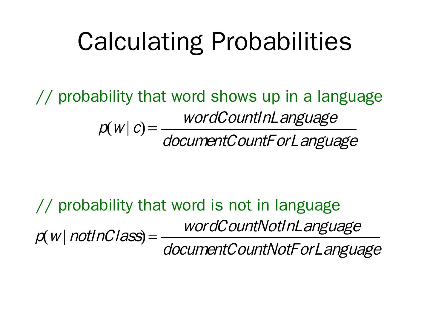 25 .Calculating Probabilities // probability that word shows up in a language // probability that word is not in language