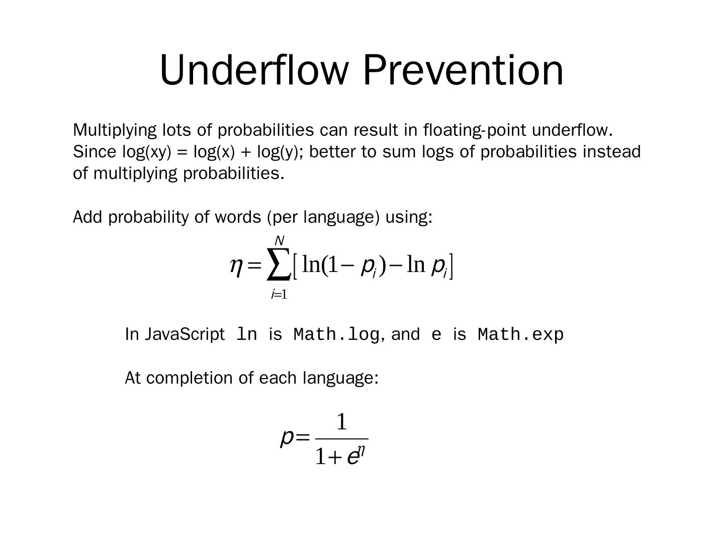 26 .Underflow Prevention Multiplying lots of probabilities can result in floating-point underflow. Since log( xy ) = log(x) + log(y ); better to sum logs of probabilities instead of multiplying probabilities . Add probability of words (per language) using: In JavaScript ln is Math.log , and e is Math.exp At completion of each language: