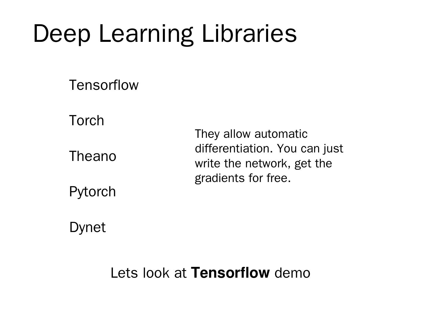Dynet. They allow automatic. differentiation. You can just. write the network, get the gradients for free. Lets look at Tensorflow demo. 31. Comments on Training.