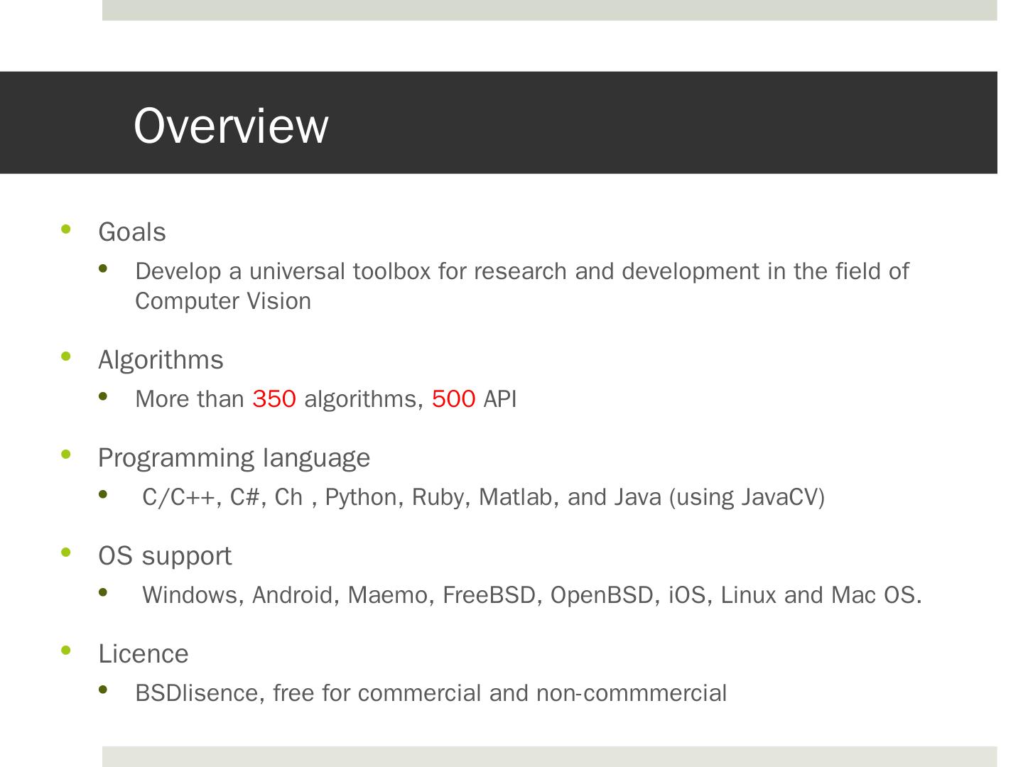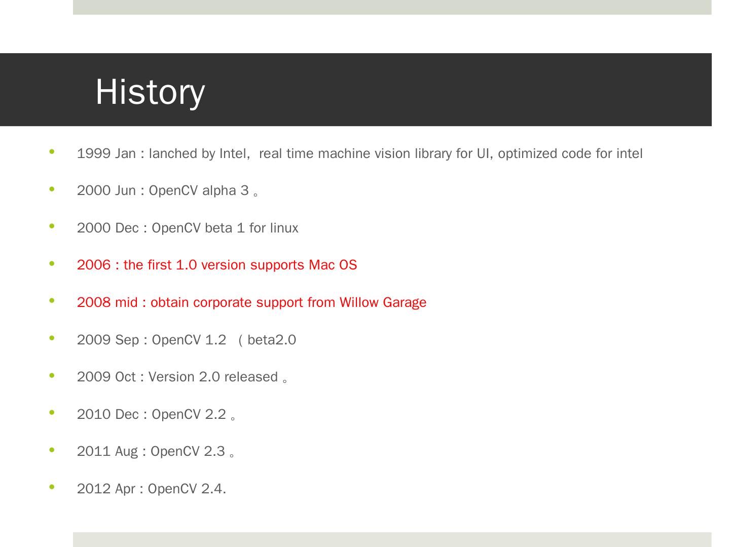 1999 Jan : lanched by Intel, real time machine vision library for UI, optimized code for intel; 2000 Jun : OpenCV alpha 3。 2000 Dec : OpenCV ...