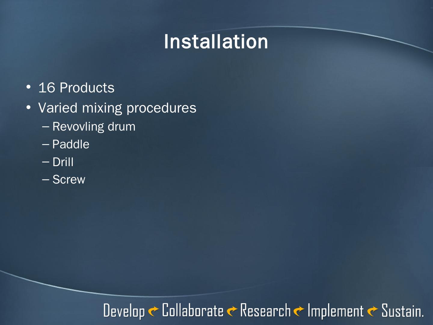 Revolving drum; Paddle; Injection; Drill; Screw; Compaction; Heated trailer. Installation. Placing and finishing procedures were similar; Curing ...