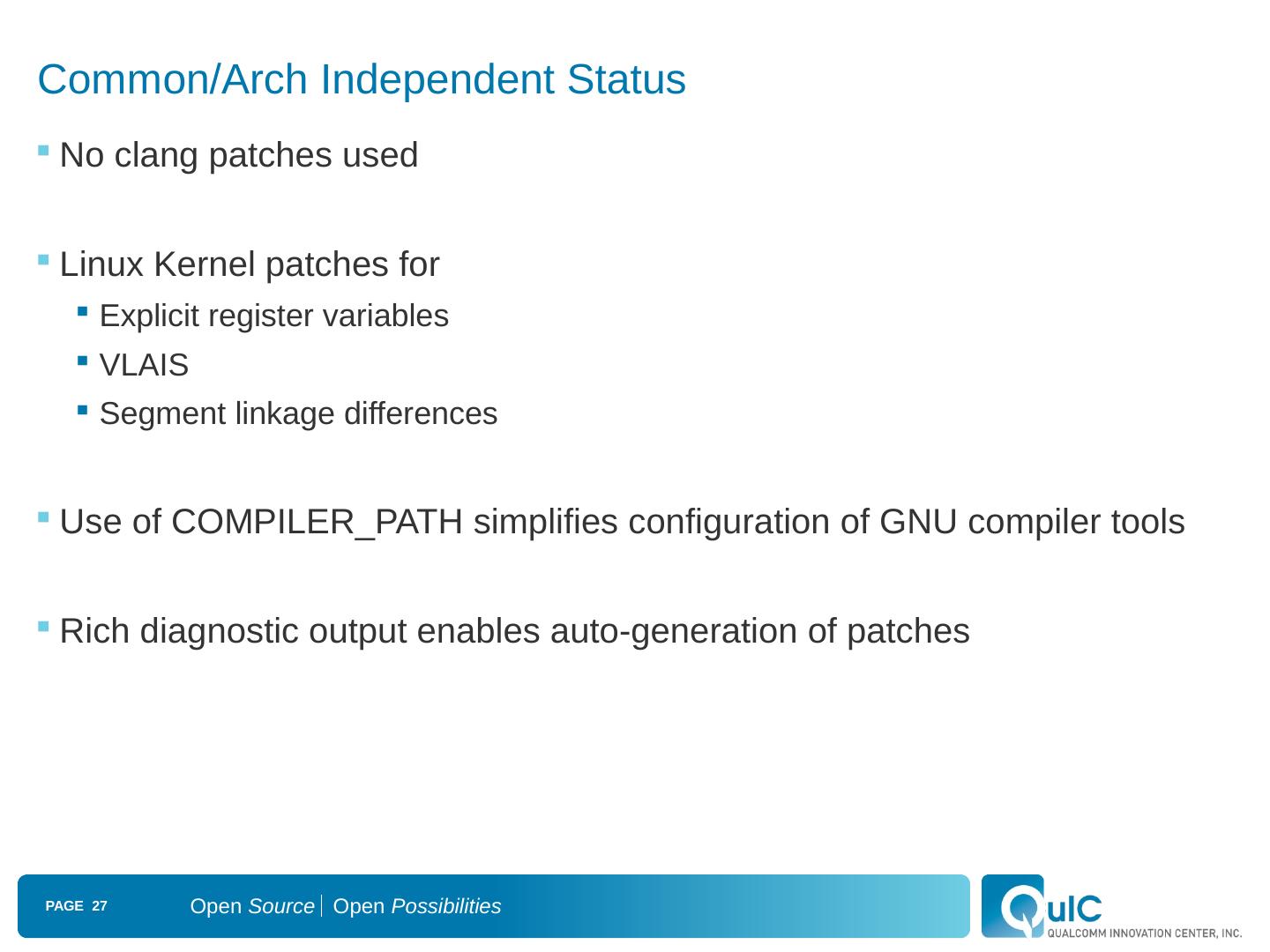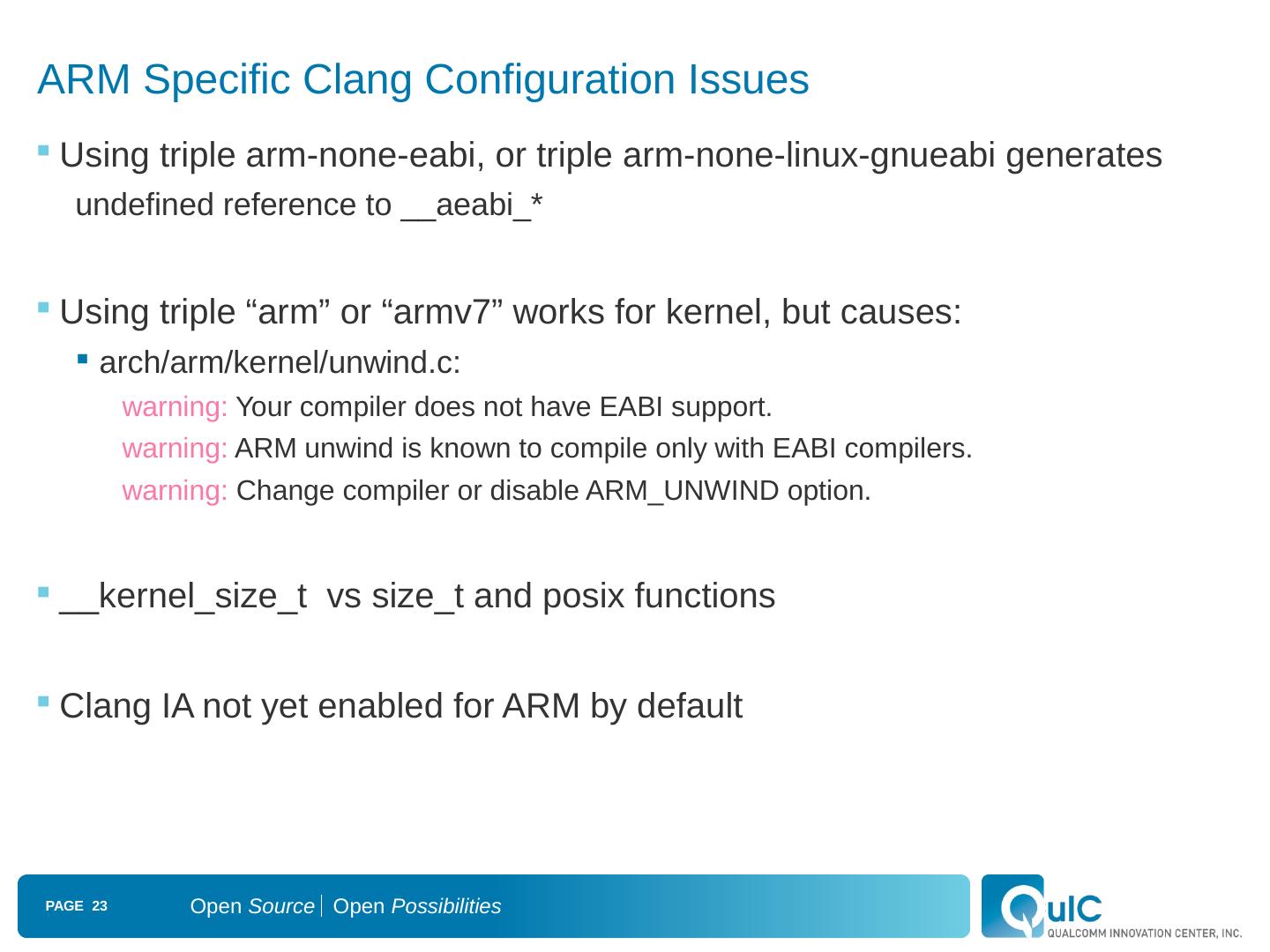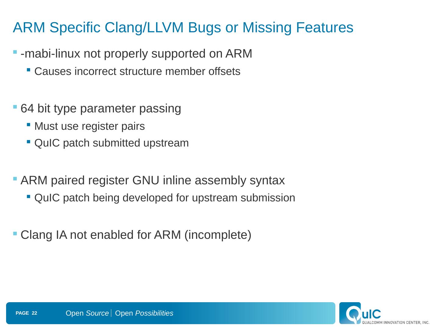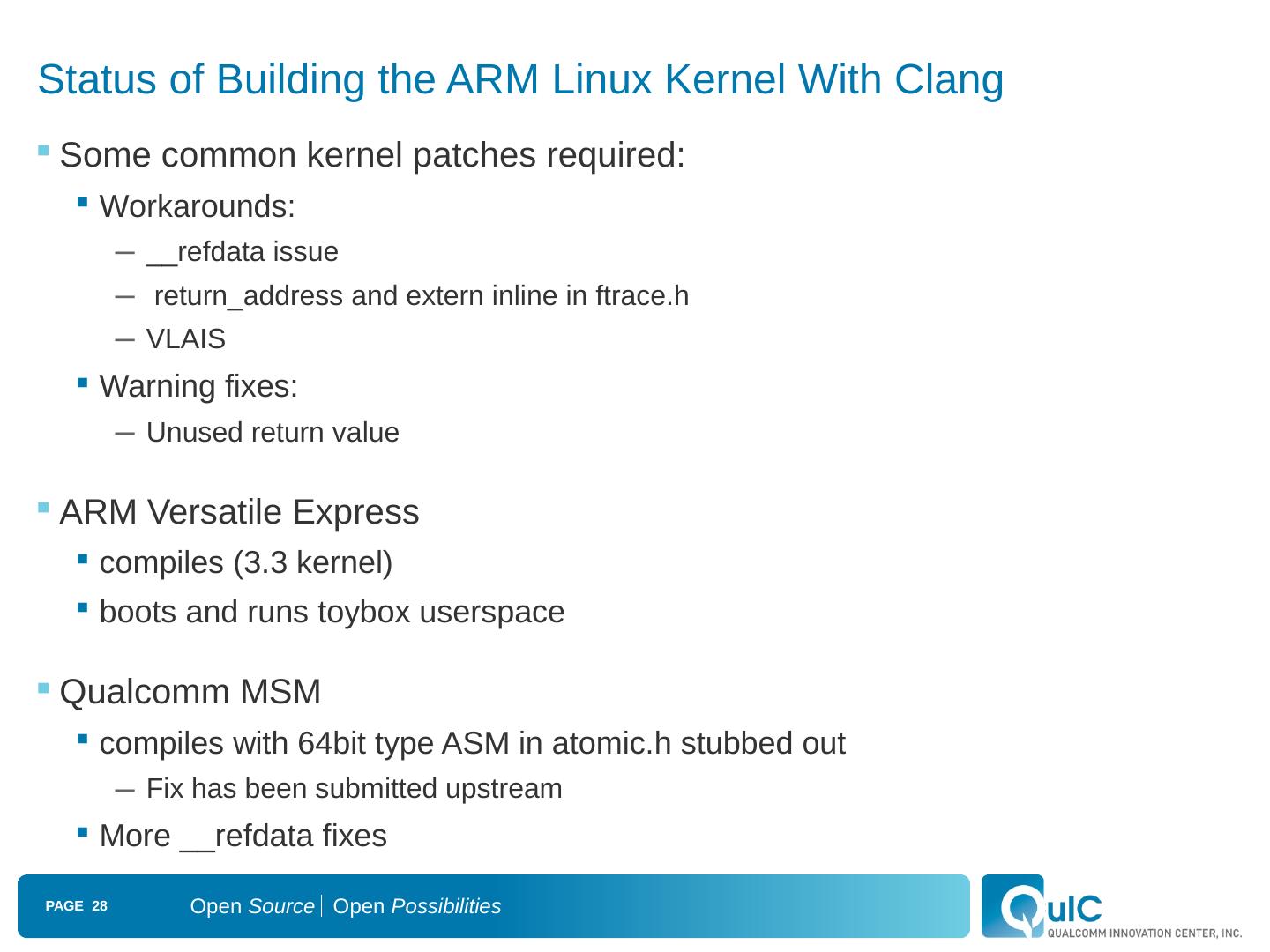 LLVM / CLang提供了更多更好的调试和提示信息,速度也较gcc更快,越来越多的人喜欢用llvm和clang,在ARM的交叉编译平台也有不俗的表现,在各种Linux操作系统都有对llvm/clang的支持,现在也有工程师尝试用clang来编译Linux内核,然而,Linux内核代码对gcc的一些古怪的特性有依赖,加上gcc特有的编译选项,让clang来编译(交叉编译)Linux内核还是有不少问题需要解决,好在类似高通这样的公司一直在整理相关的问题和解决方案。