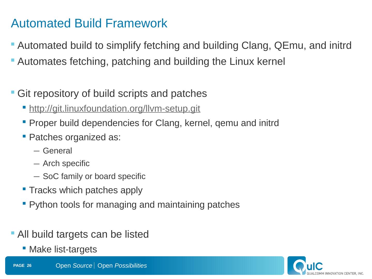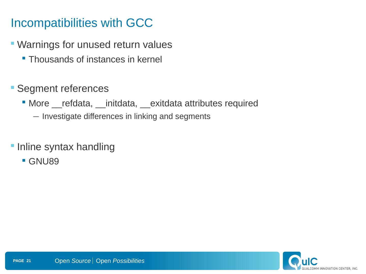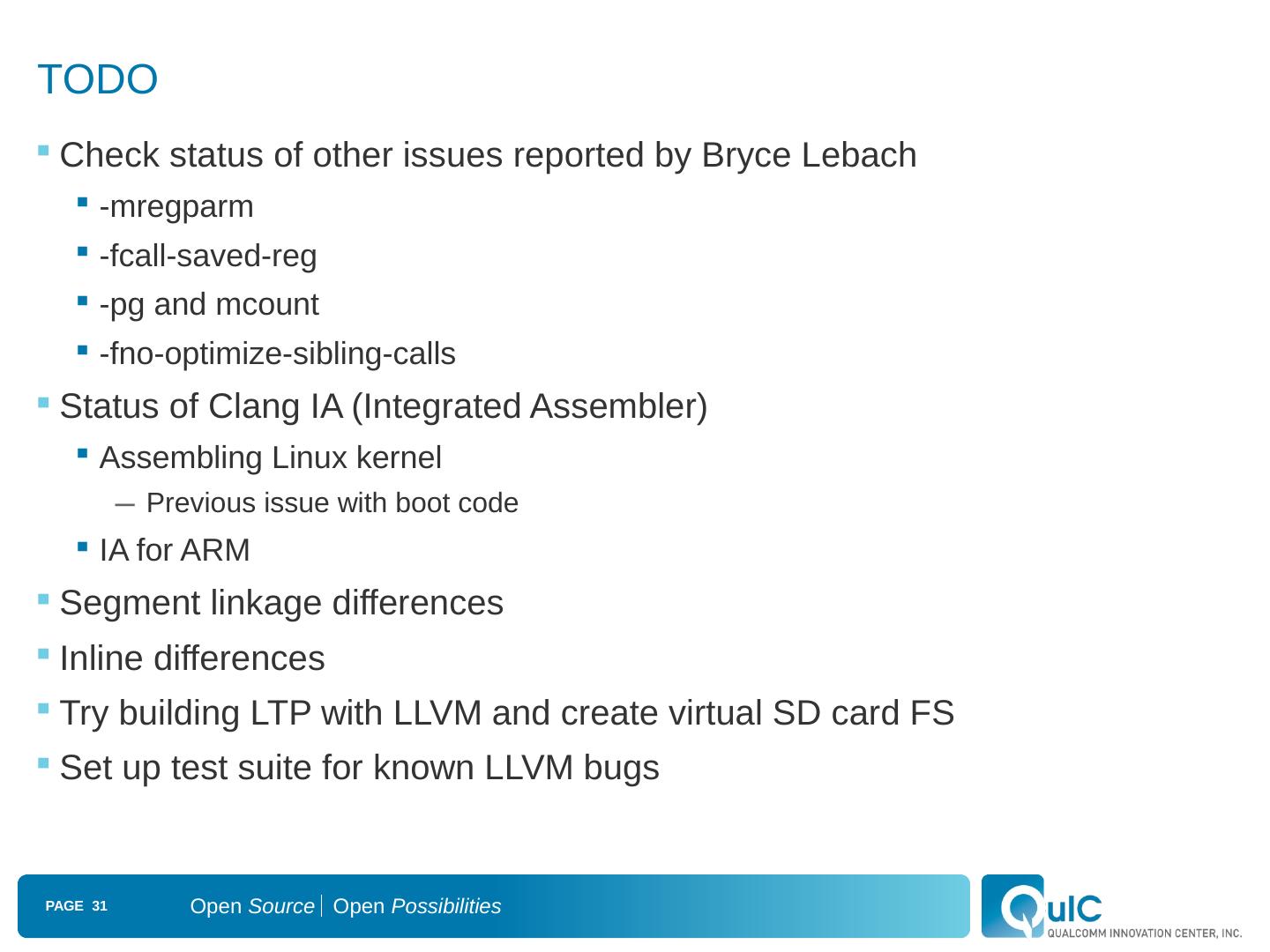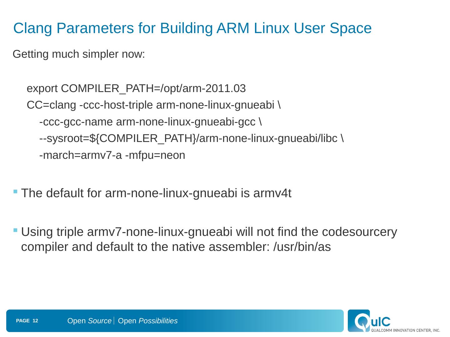 LLVM / CLang提供了更多更好的调试和提示信息,速度也较gcc更快,越来越多的人喜欢用llvm和clang,在ARM的交叉编译平台也有不俗的表现,在各种Linux操作系统都有对llvm/clang的支持,现在也有工程师尝试用clang来编译Linux内核,然而,Linux内核代码对gcc的一些古怪的特性有依赖,加上gcc特有的编译选项,让clang来编译(交叉编译)Linux内核还是有不少问题需要解决,好在类似高通这样的公司一直在整理相关的问题和解决方案。