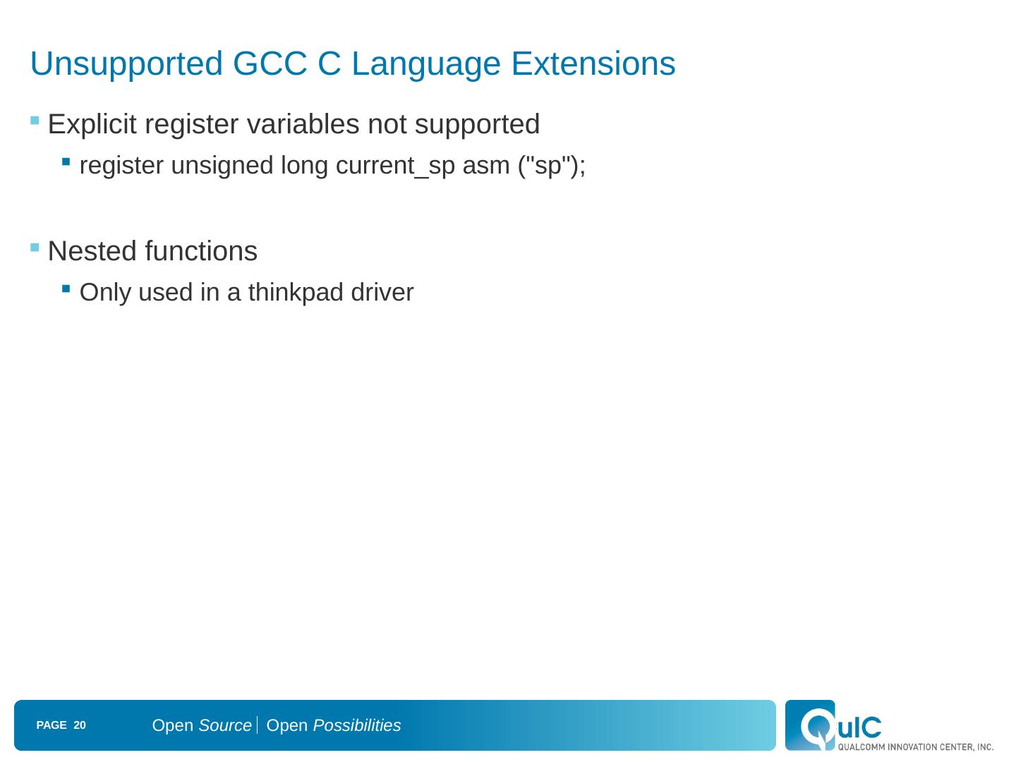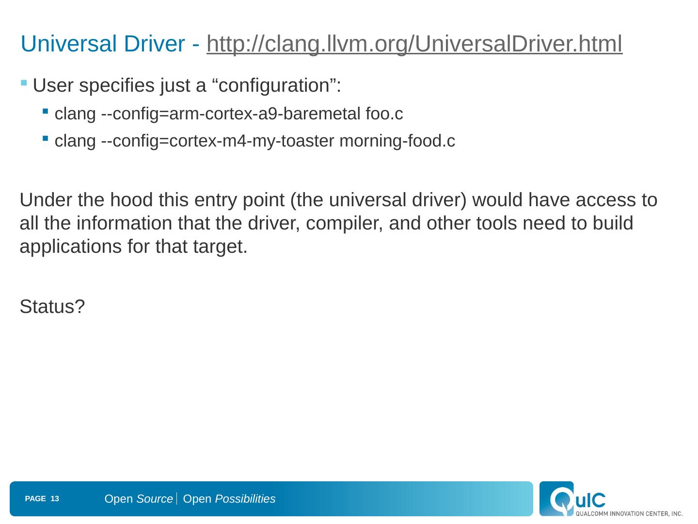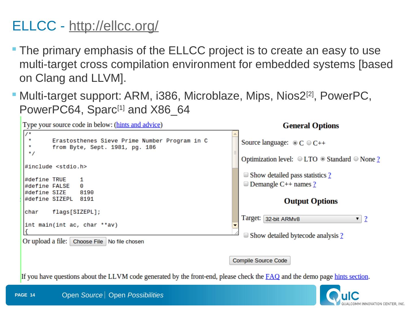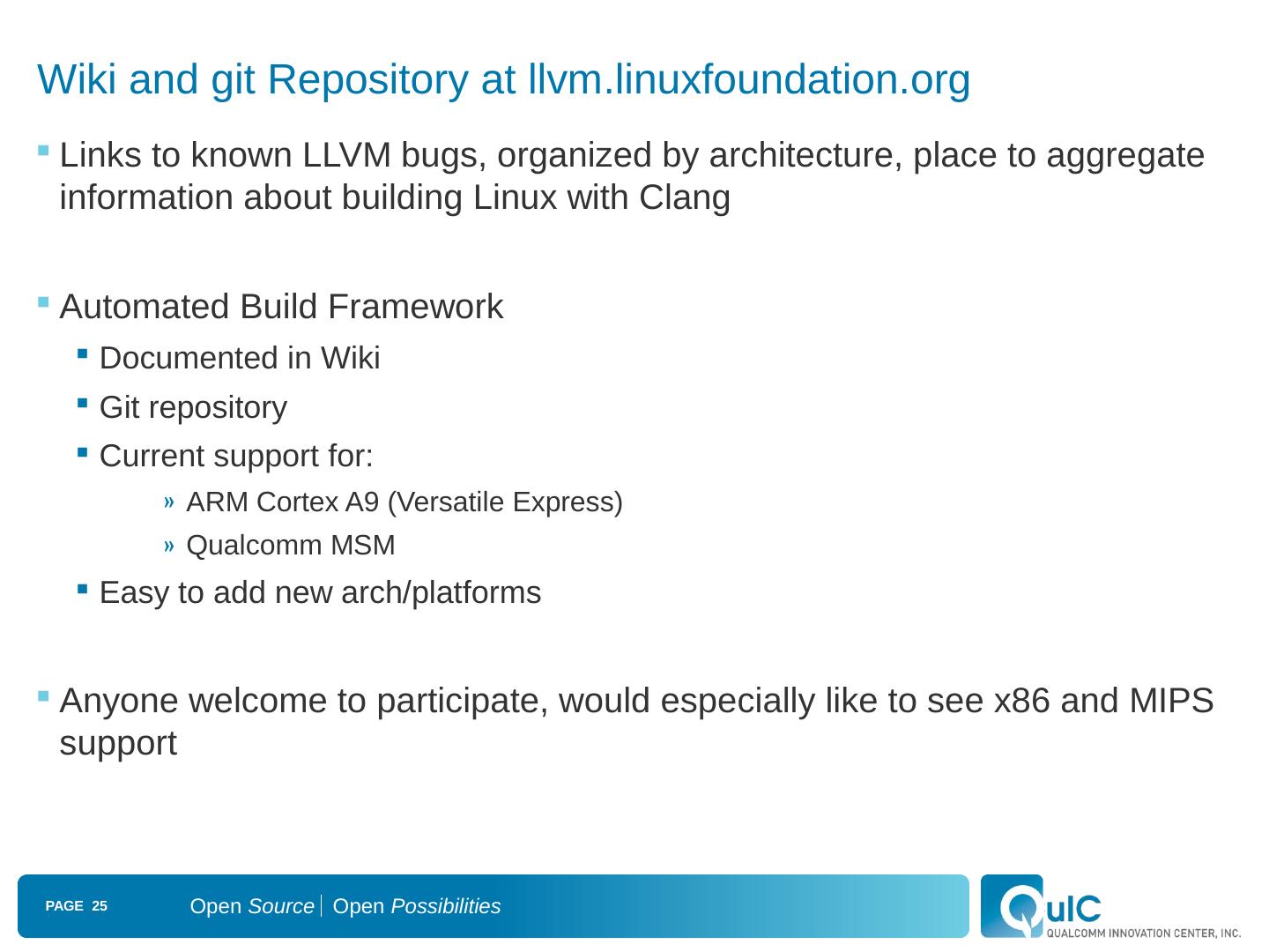 LLVM / CLang提供了更多更好的调试和提示信息,速度也较gcc更快,越来越多的人喜欢用llvm和clang,在ARM的交叉编译平台也有不俗的表现,在各种Linux操作系统都有对llvm/clang的支持,现在也有工程师尝试用clang来编译Linux内核,然而,Linux内核代码对gcc的一些古怪的特性有依赖,加上gcc特有的编译选项,让clang来编译(交叉编译)Linux内核还是有不少问题需要解决,好在类似高通这样的公司一直在整理相关的问题和解决方案。