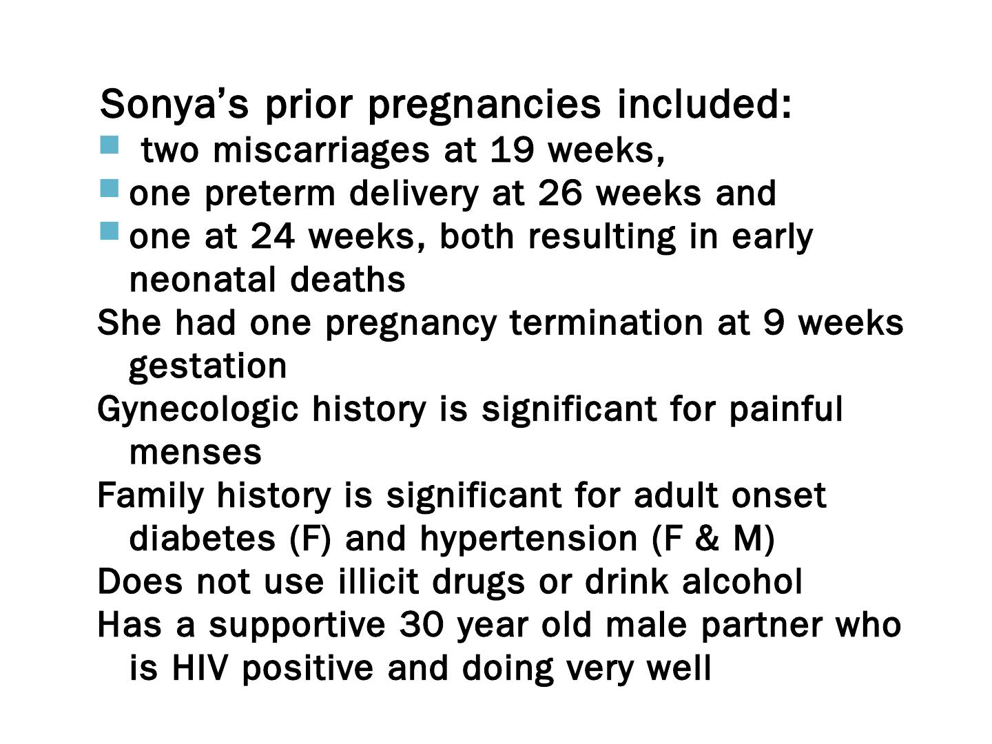 Her LNMP was 5 weeks ago. She is at the health care center for a pregnancy test. What do you want to know about Sonya? Sonya's prior pregnancies included:.