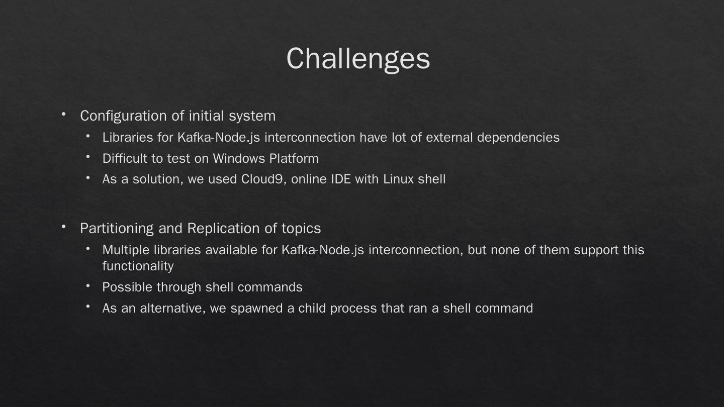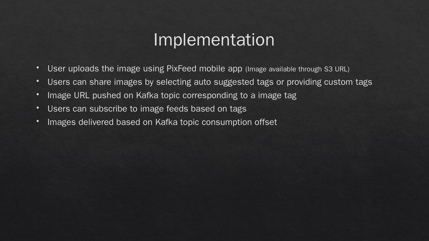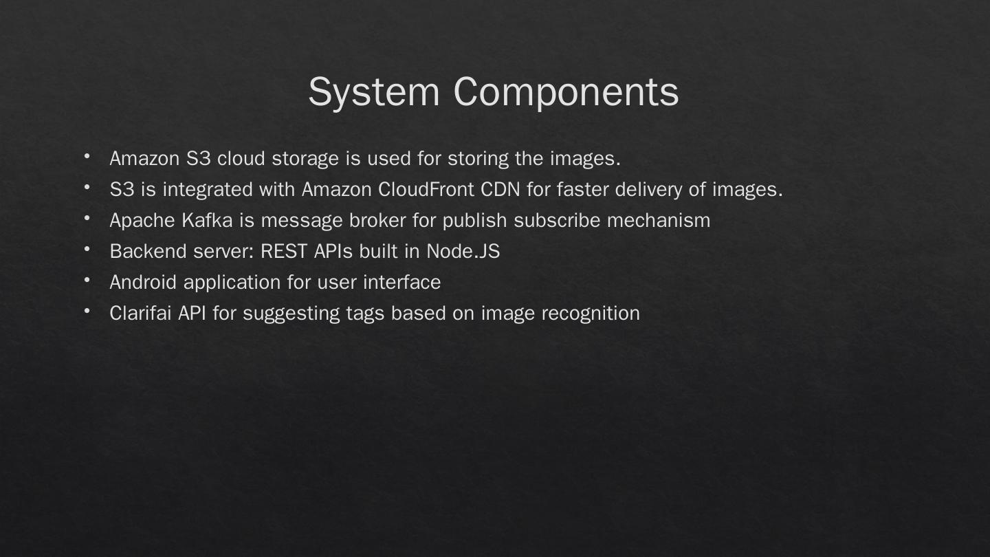 Apache Kafka is message broker for publish subscribe mechanism; Backend server: REST APIs built in Node.JS; Android application for user interface; Clarifai ...