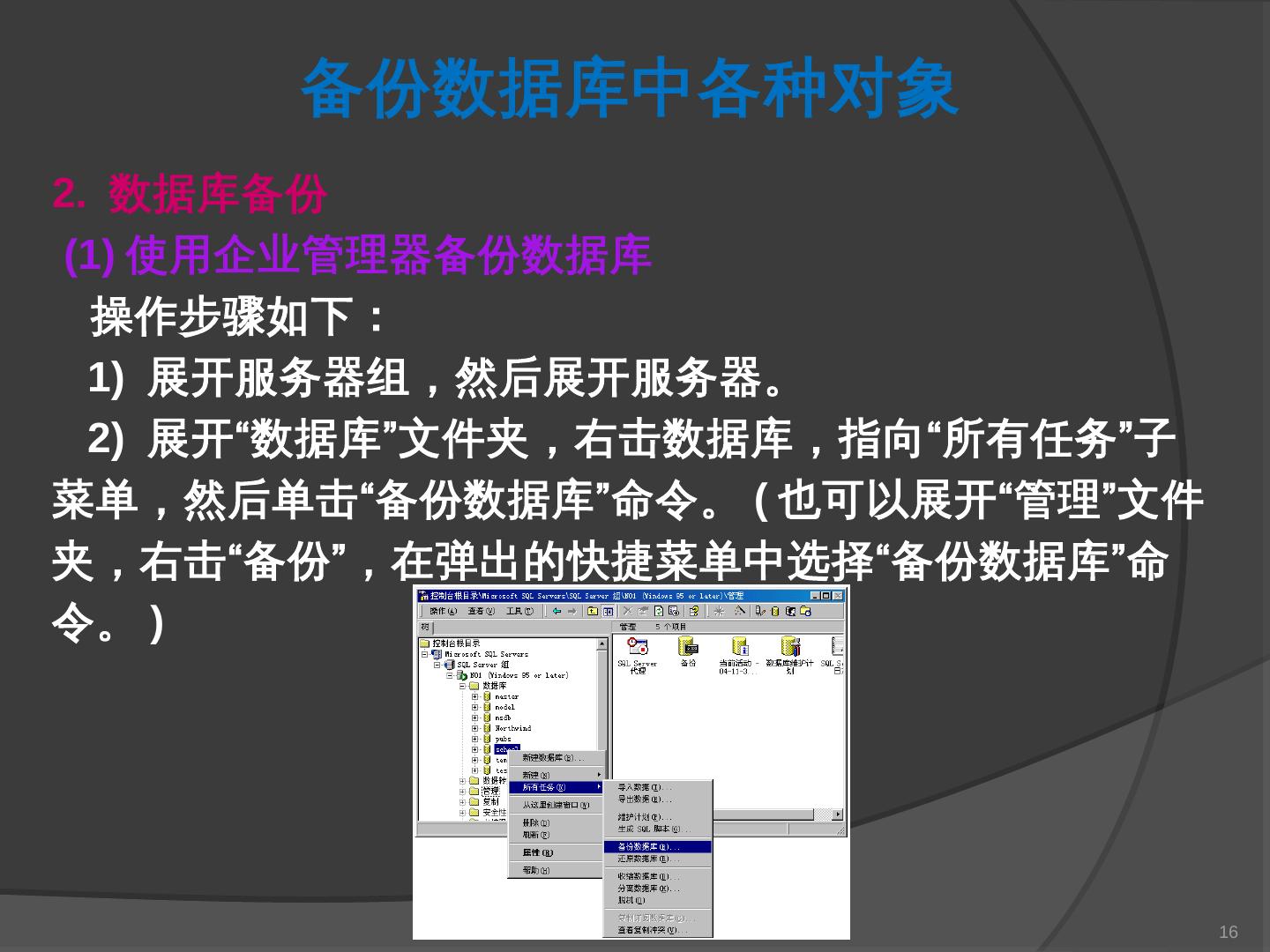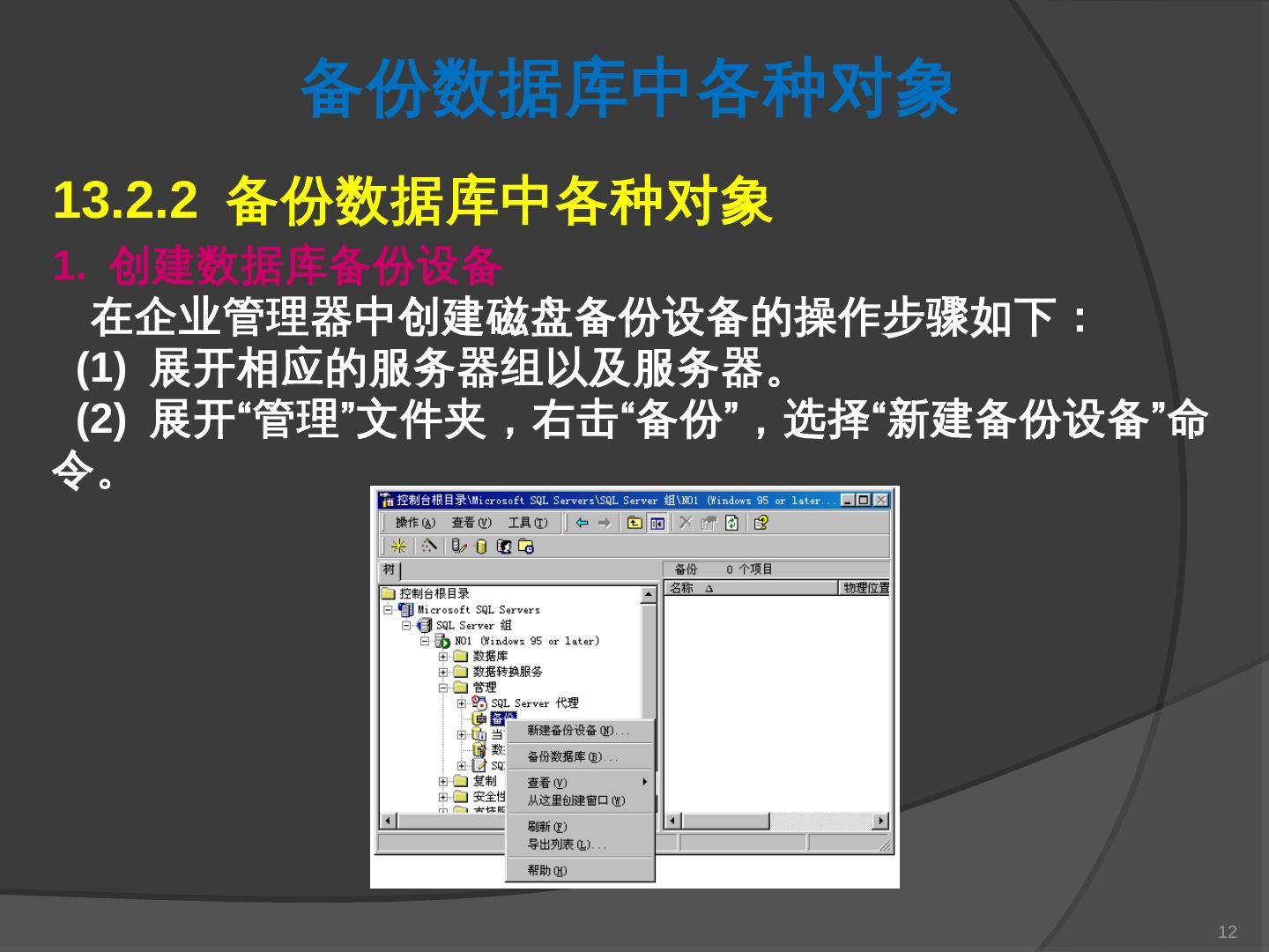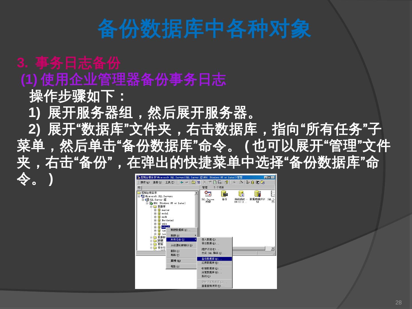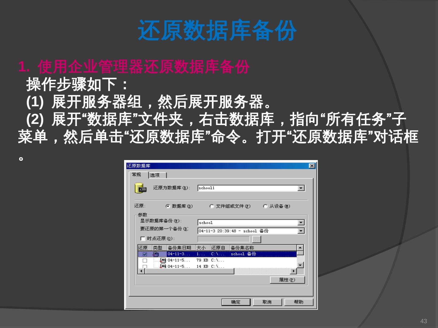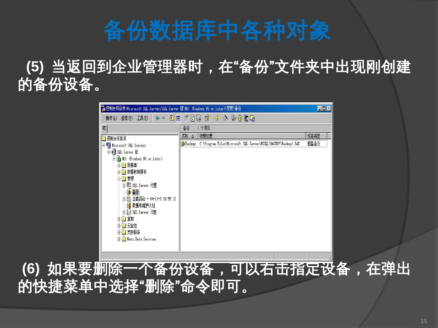 本章主要介绍SQL Server 2000中数据库的备份与还原。通过本章的学习,应掌握 ... SQL Server提供了一套功能强大、安全的数据备份和还原工具。数据的备份和还原 ...