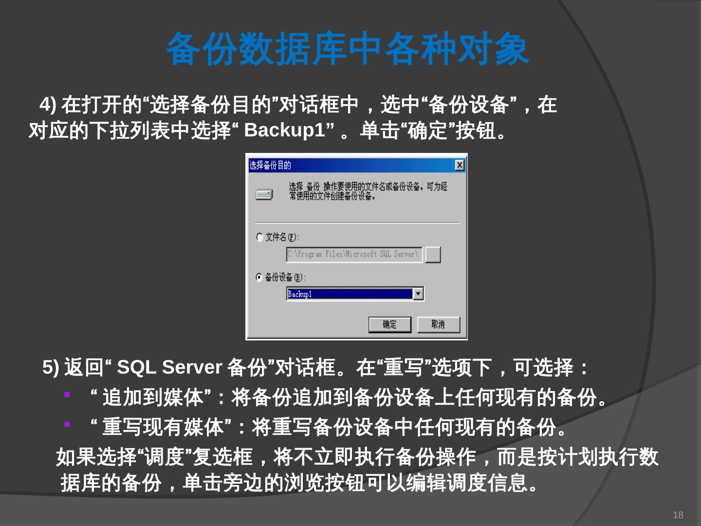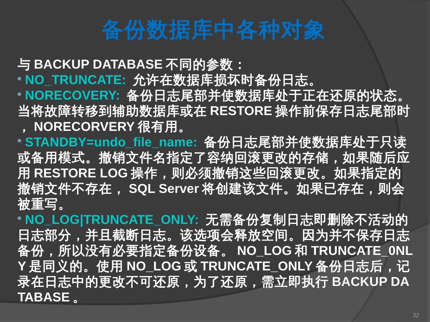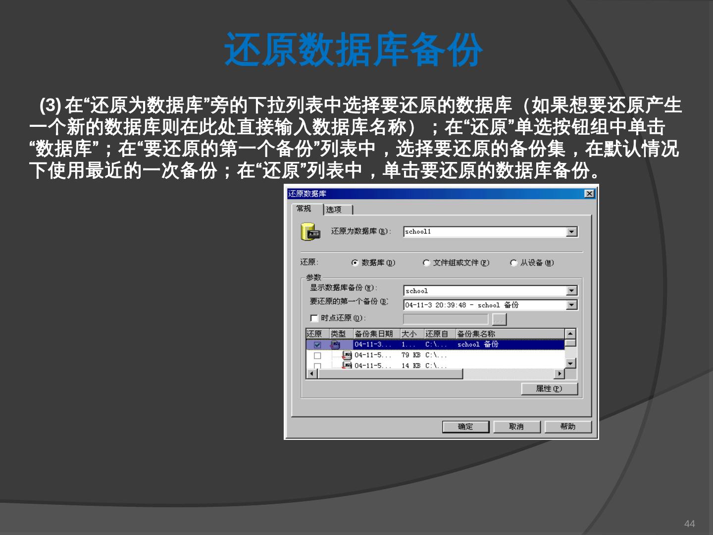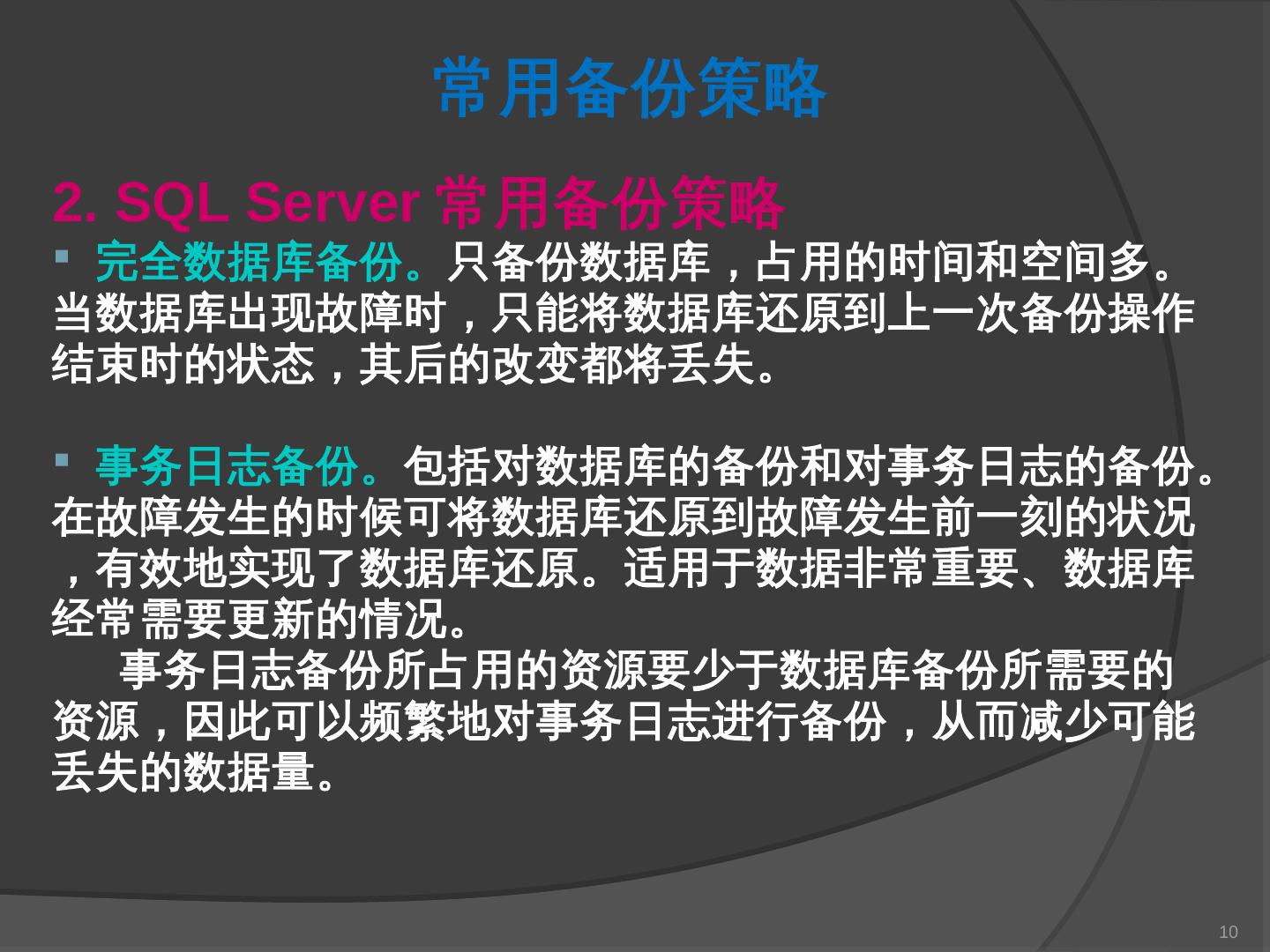 本章主要介绍SQL Server 2000中数据库的备份与还原。通过本章的学习,应掌握 ... SQL Server提供了一套功能强大、安全的数据备份和还原工具。数据的备份和还原 ...