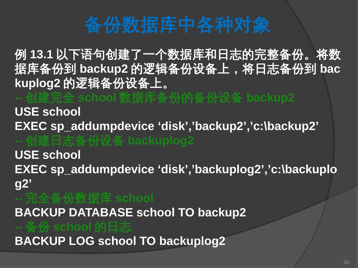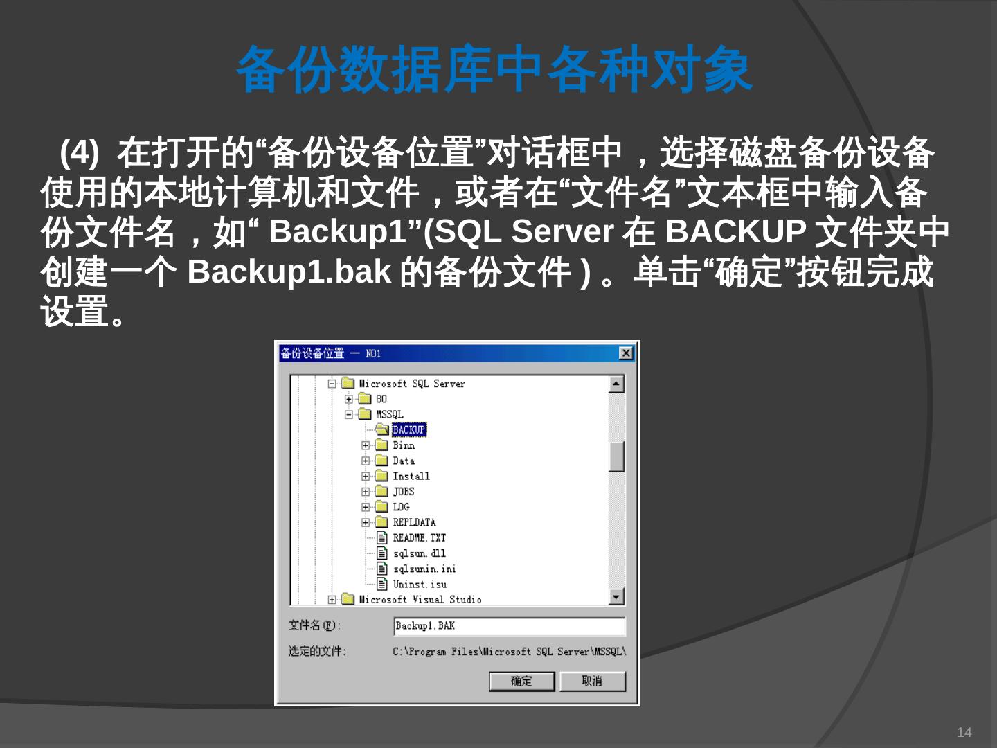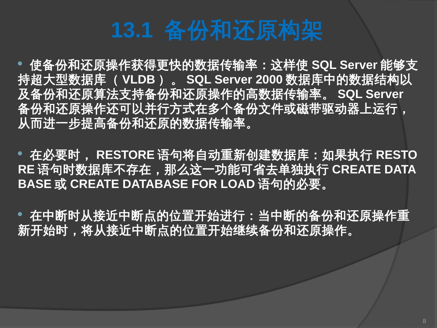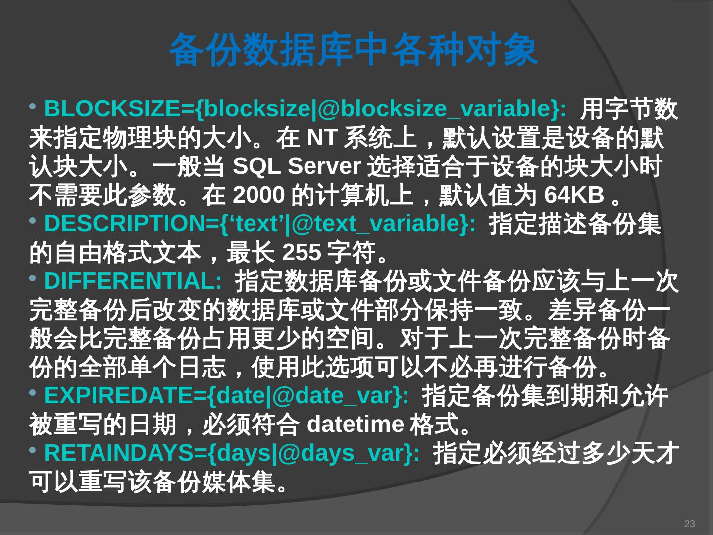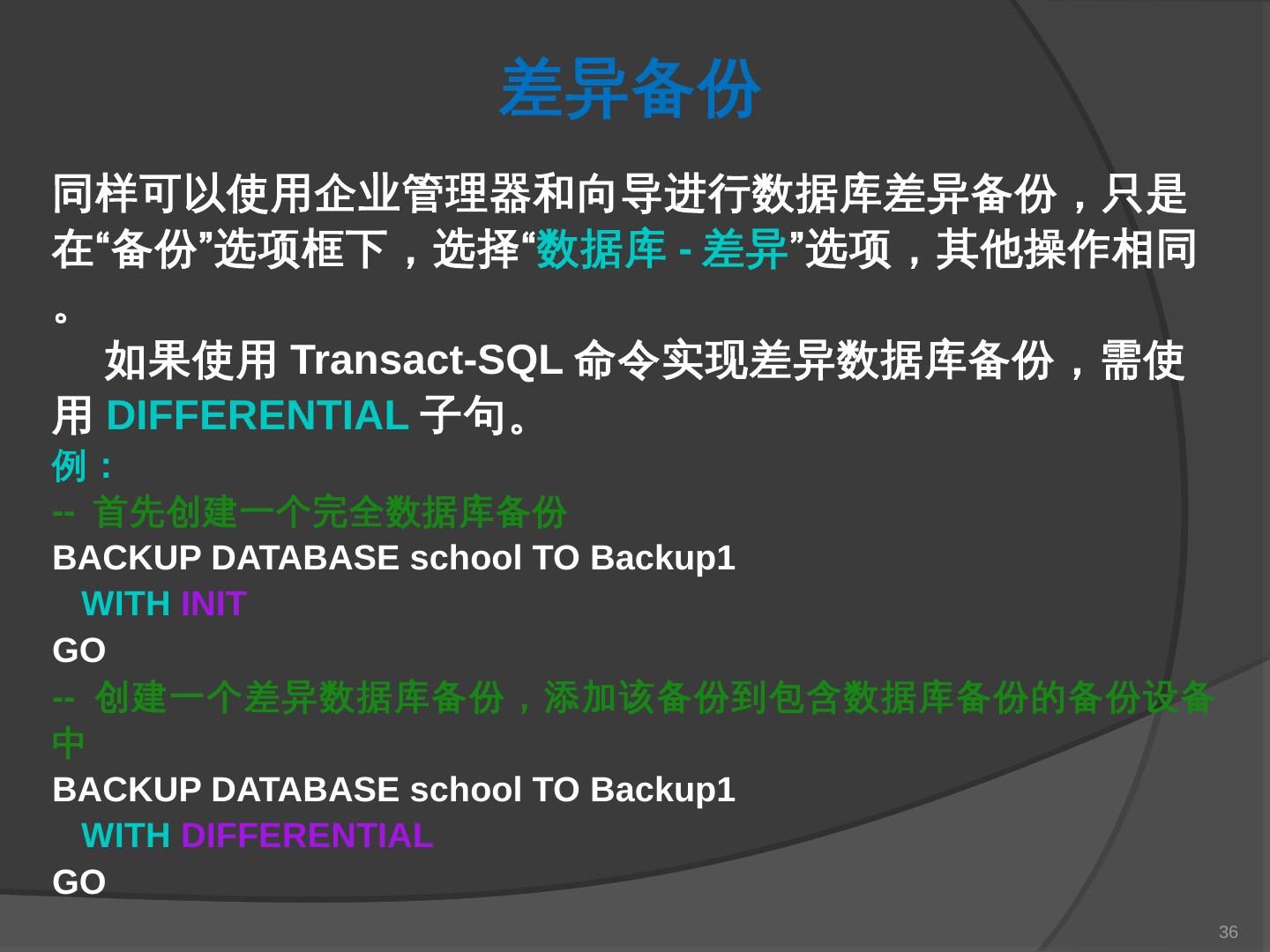 本章主要介绍SQL Server 2000中数据库的备份与还原。通过本章的学习,应掌握 ... SQL Server提供了一套功能强大、安全的数据备份和还原工具。数据的备份和还原 ...