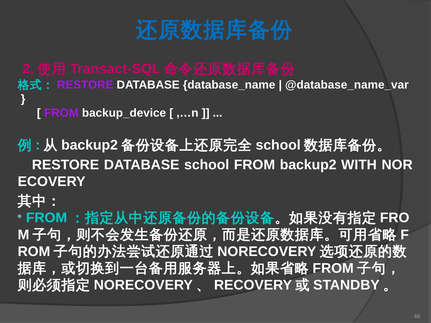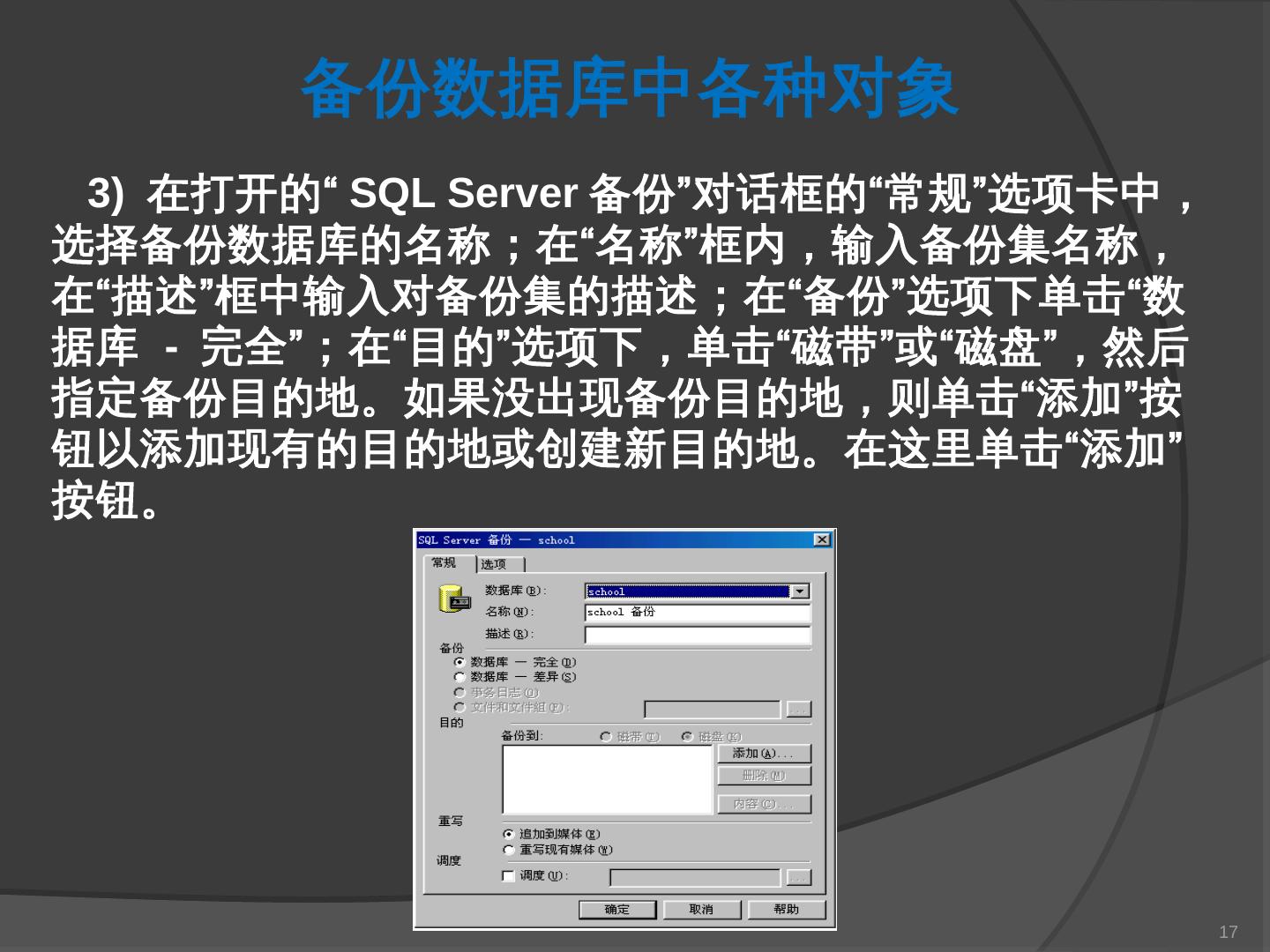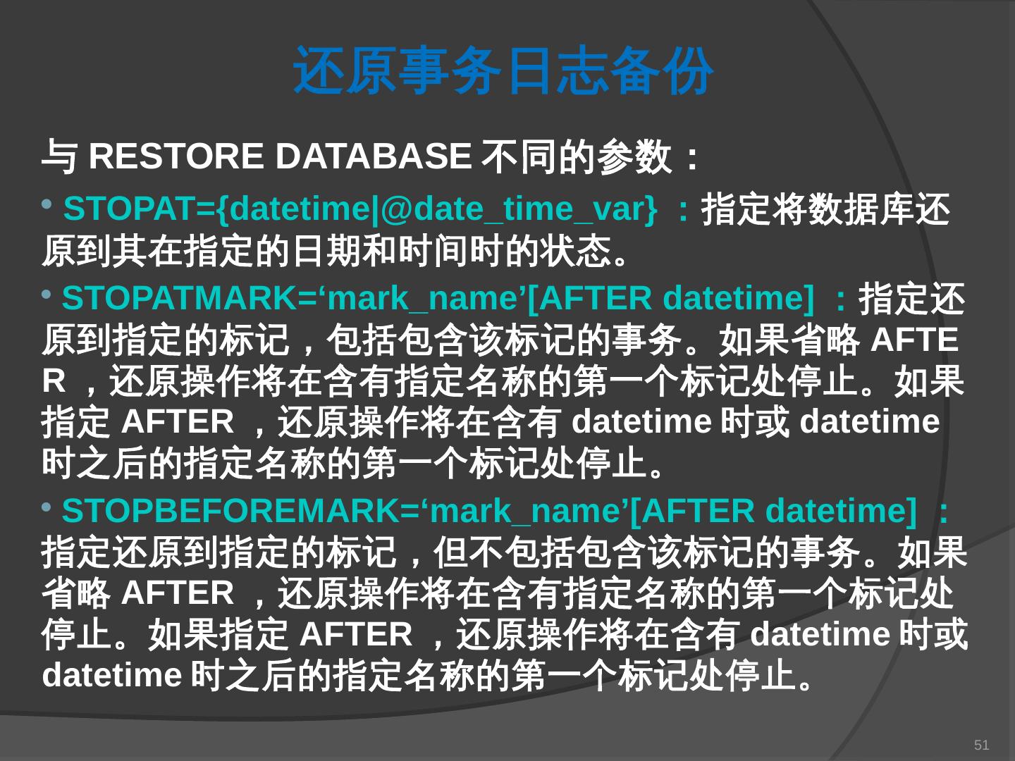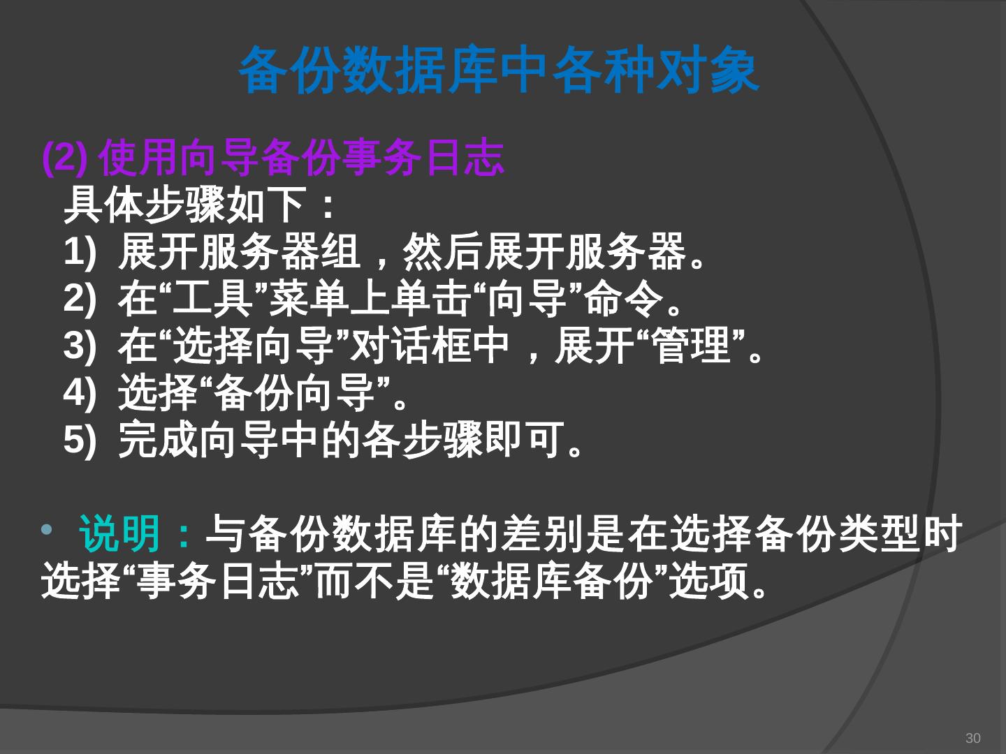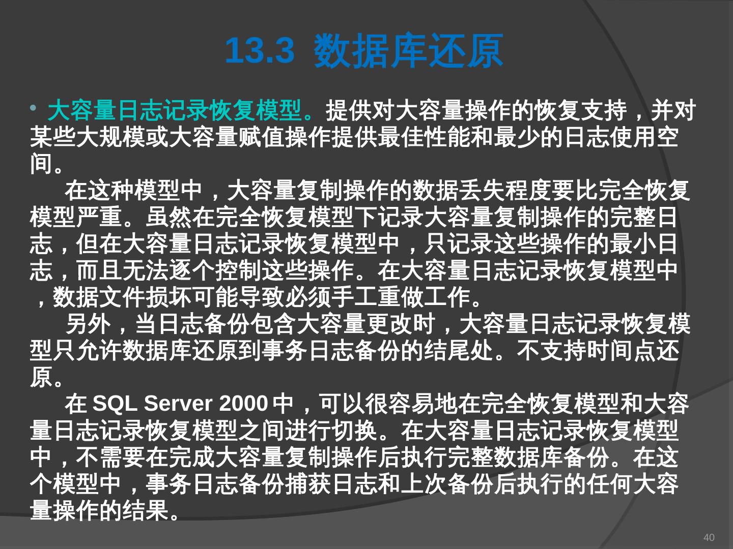 本章主要介绍SQL Server 2000中数据库的备份与还原。通过本章的学习,应掌握 ... SQL Server提供了一套功能强大、安全的数据备份和还原工具。数据的备份和还原 ...
