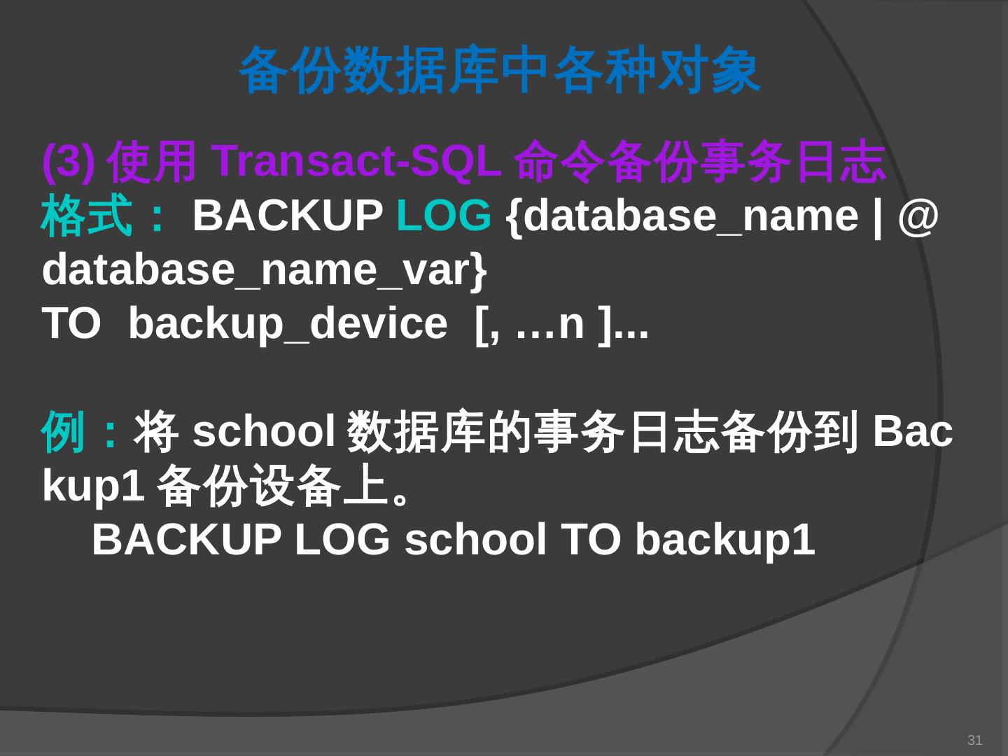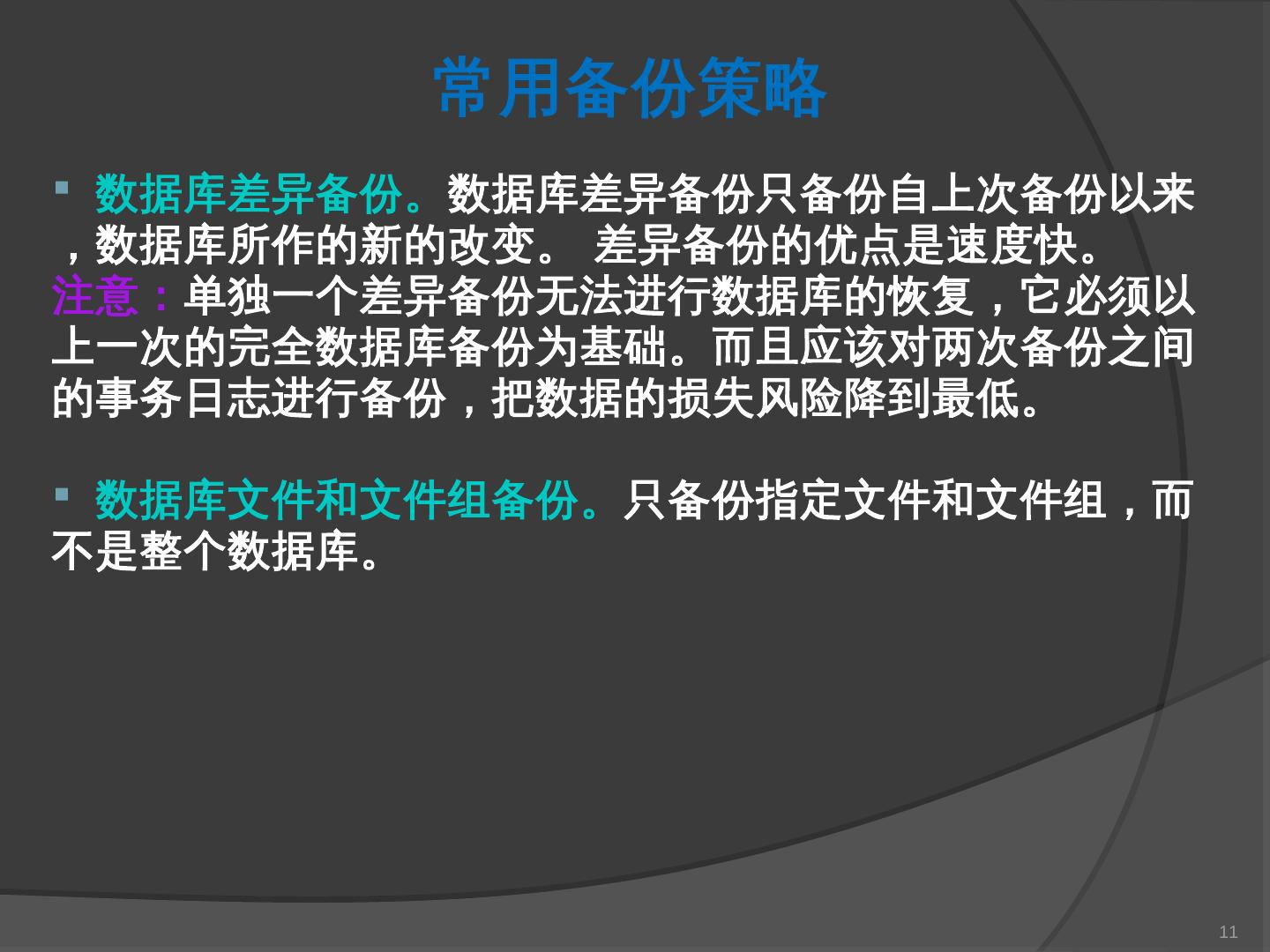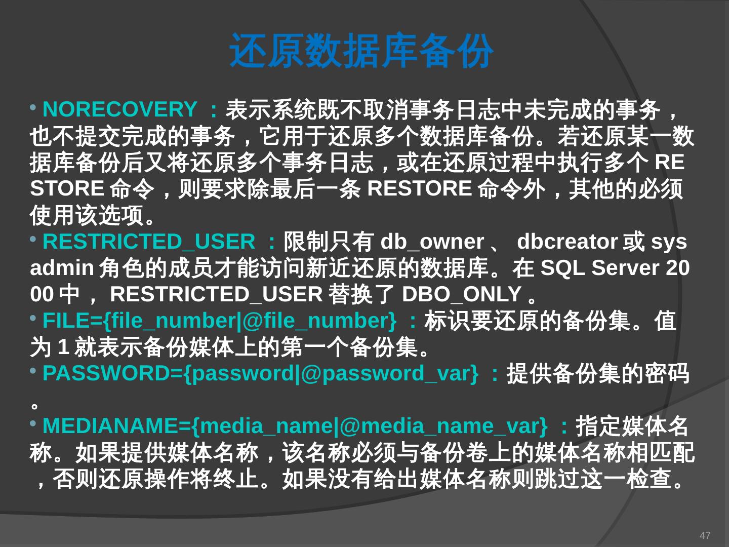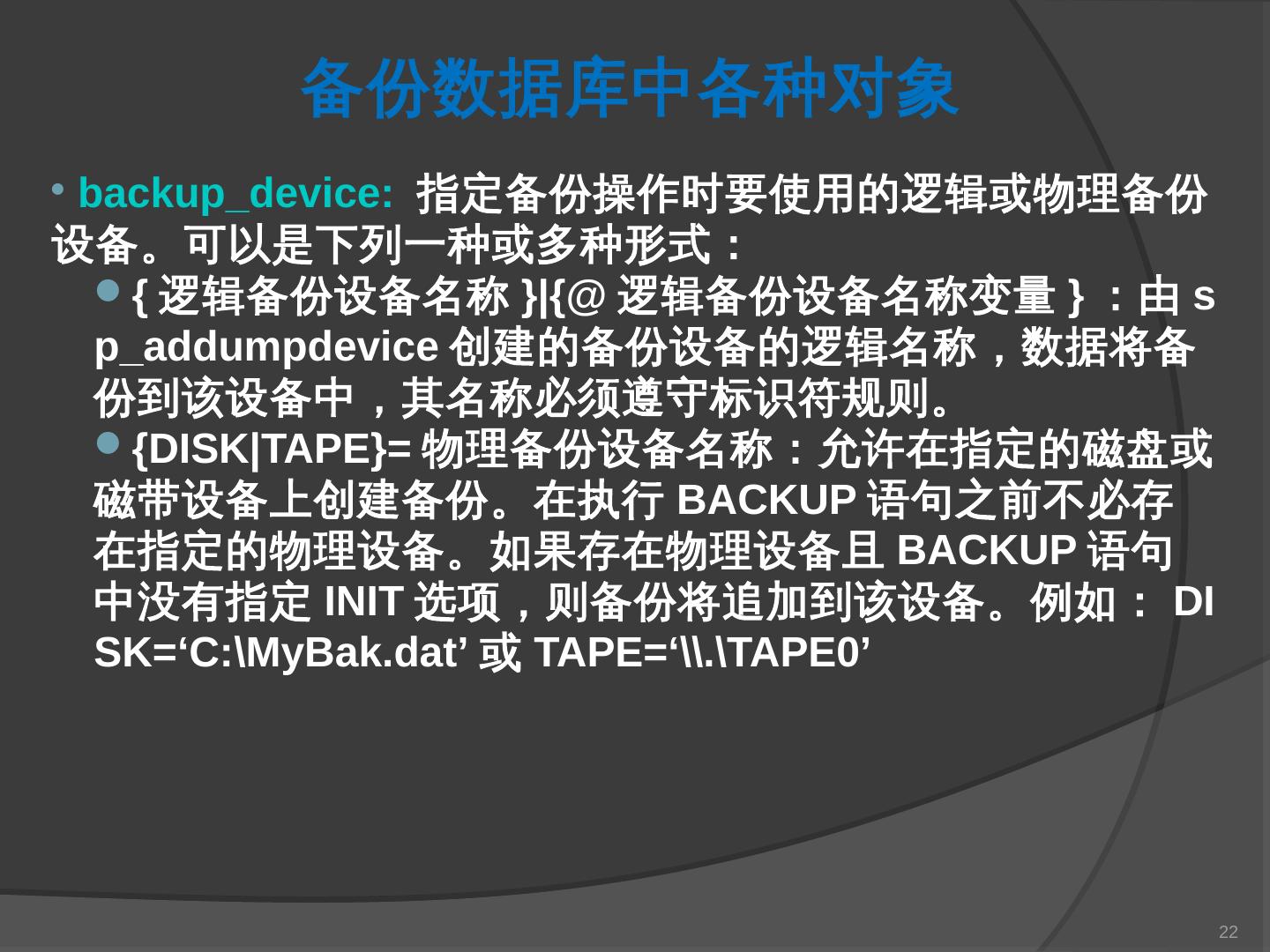 本章主要介绍SQL Server 2000中数据库的备份与还原。通过本章的学习,应掌握 ... SQL Server提供了一套功能强大、安全的数据备份和还原工具。数据的备份和还原 ...