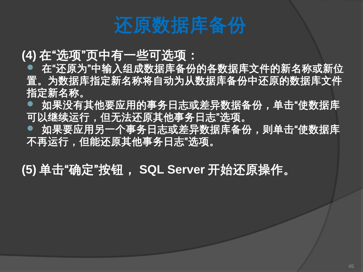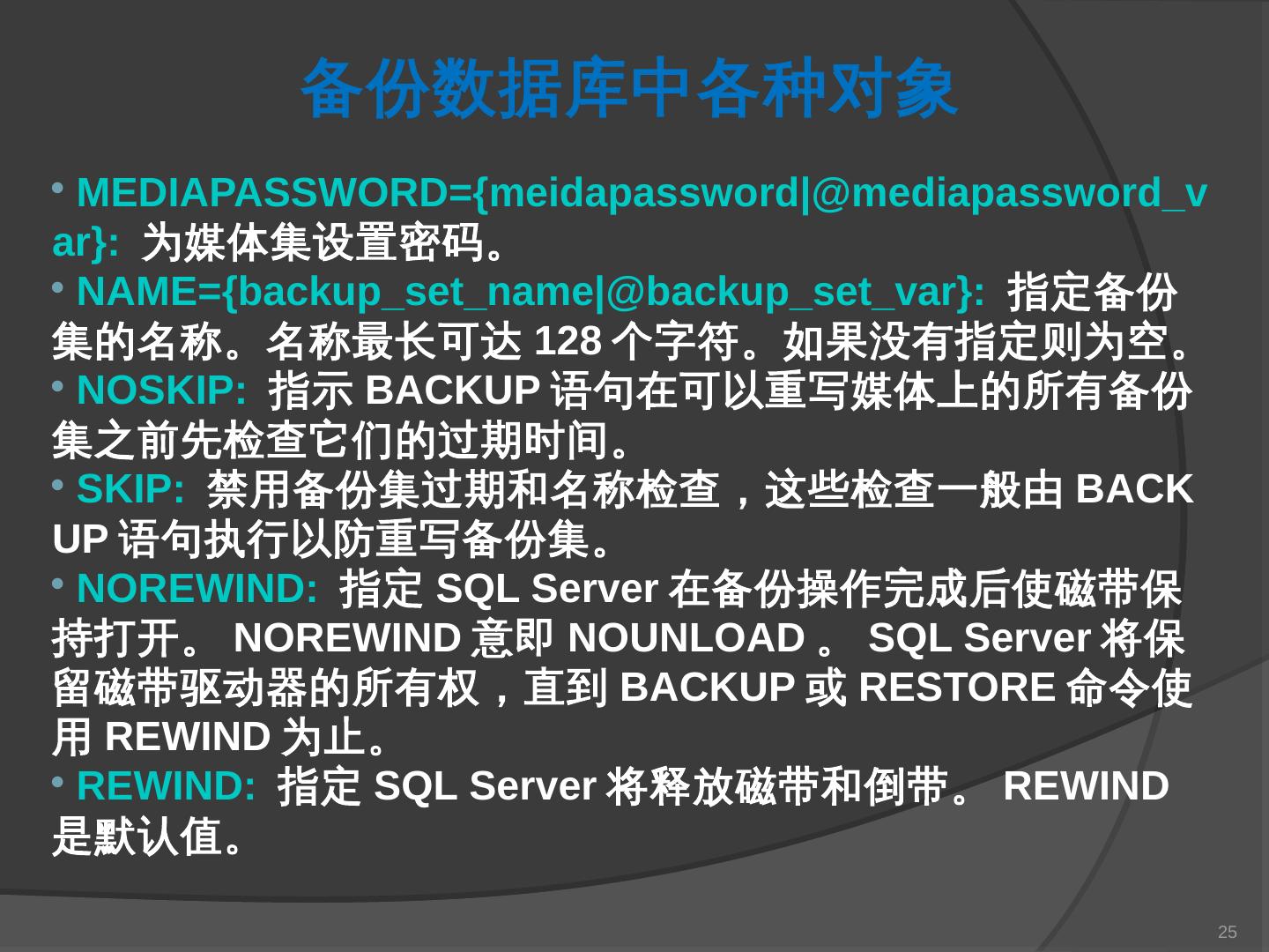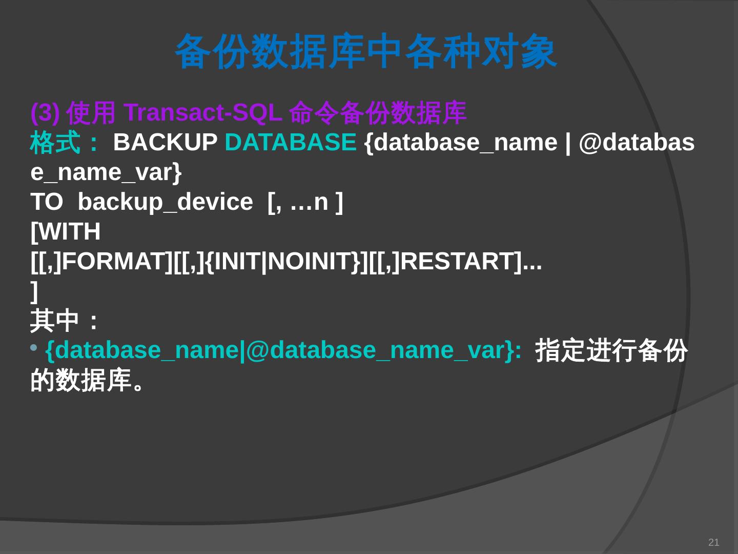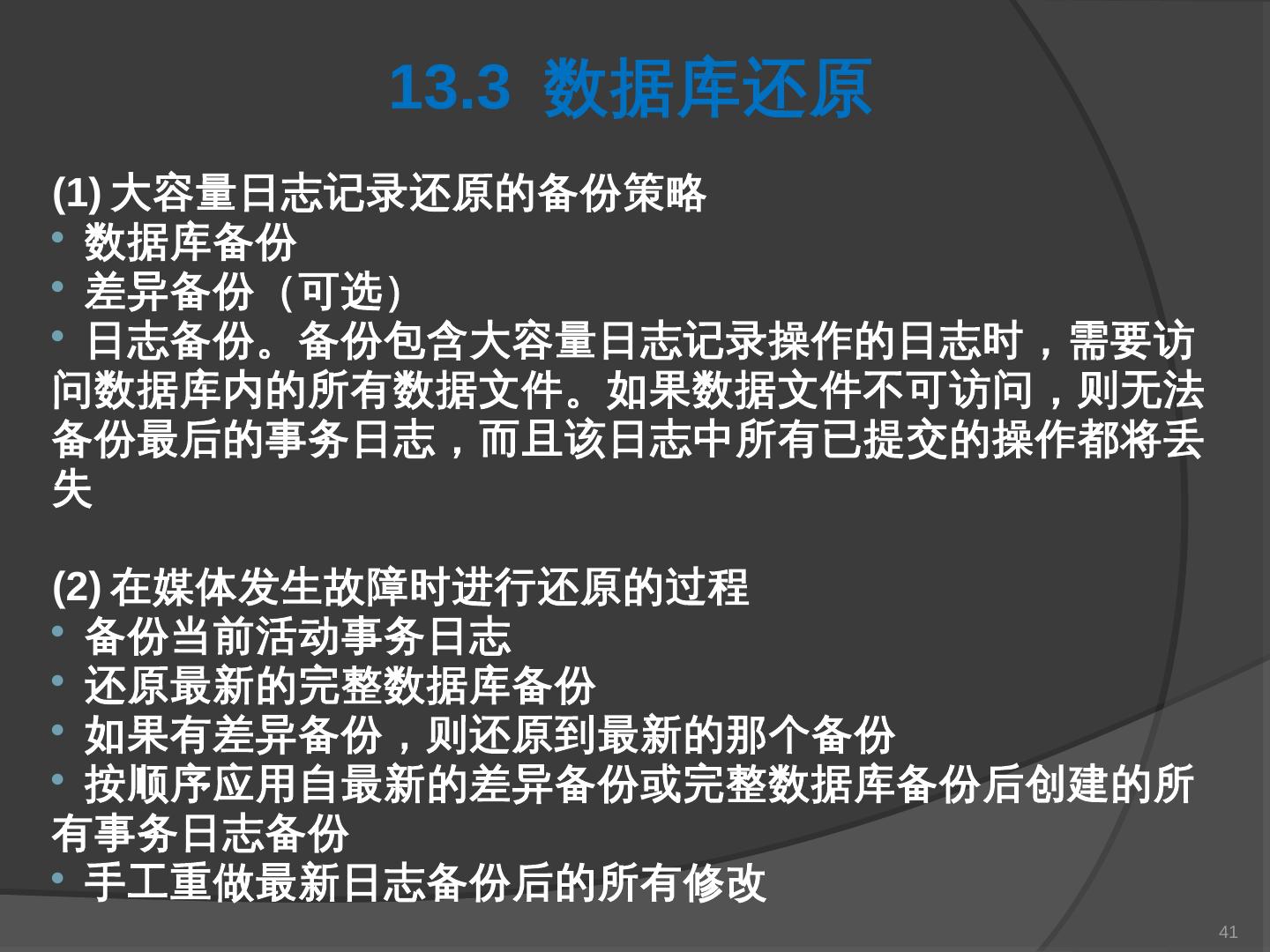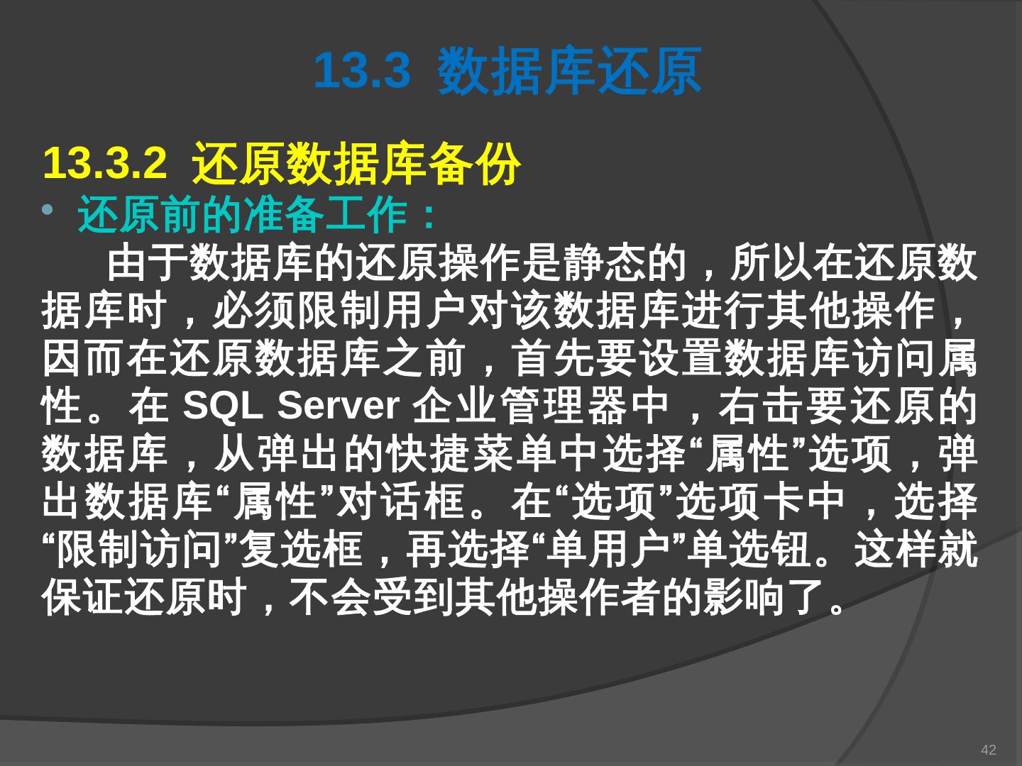 本章主要介绍SQL Server 2000中数据库的备份与还原。通过本章的学习,应掌握 ... SQL Server提供了一套功能强大、安全的数据备份和还原工具。数据的备份和还原 ...