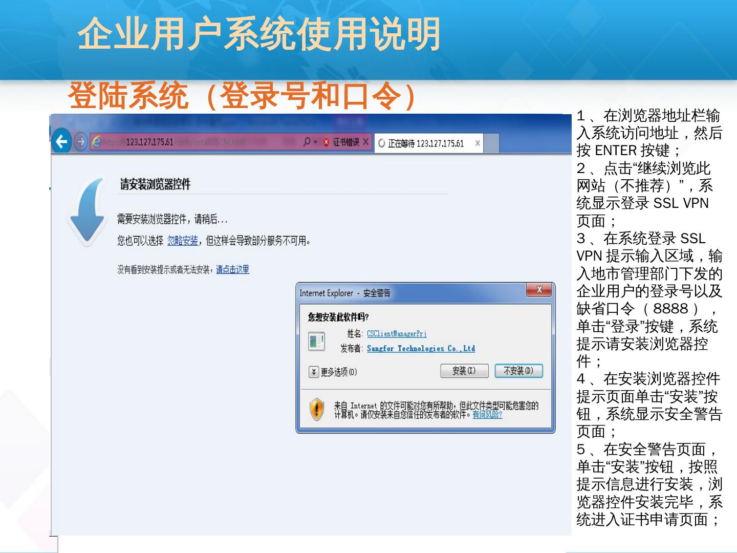 2、企业用户访问系统请采用IE8浏览器;如果个人电脑中的浏览器为IE6或IE7,请将浏览器升级 ... 2、点击“继续浏览此网站(不推荐)”,系统显示登录SSL VPN页面;.