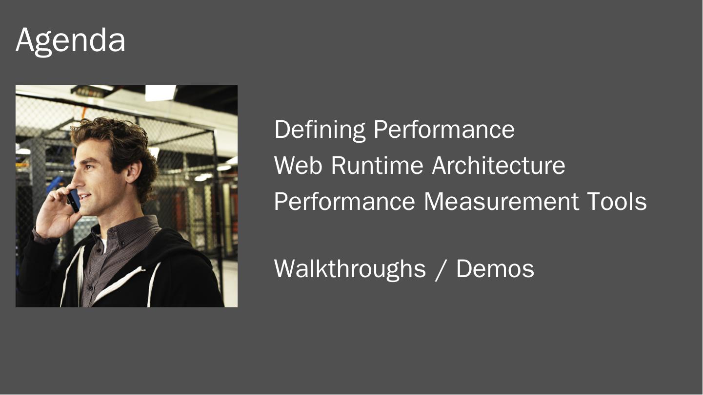 3 .Defining Performance Web Runtime Architecture Performance Measurement Tools Walkthroughs / Demos Agenda
