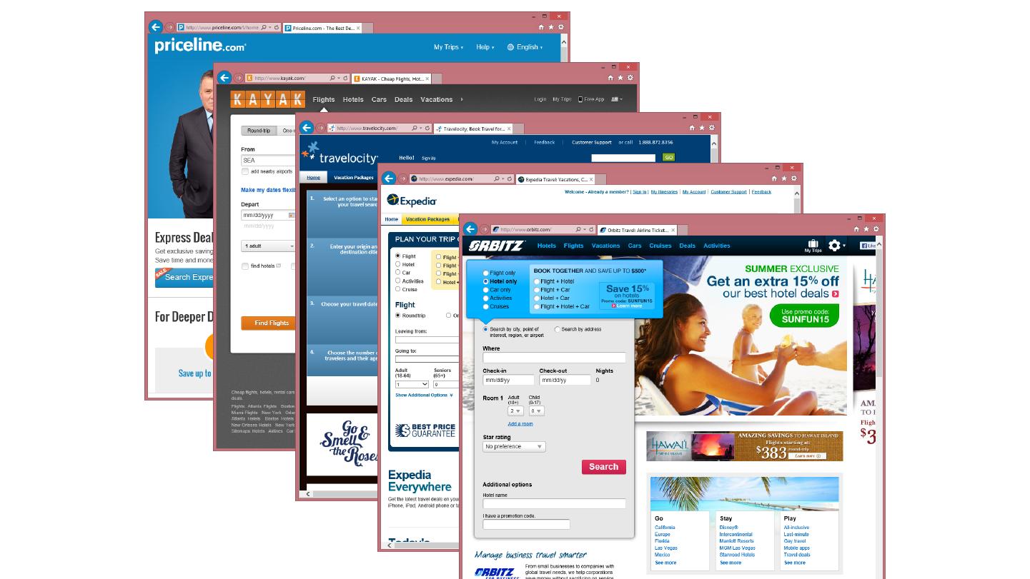 7 .Anonymized data from each of the travel sites Travel Site Content Total Size (k) Number Elements CSS Rules Image Files Script Lines (F) Script Libraries Site #1 3,697 1,504 1,392 41 77,768 Site #2 2,278 1,100 5,325 29 39,183 Site #3 1,061 2,673 1,105 66 12,643 Site #4 1,812 4,252 1,672 12 10,284 Site #5 1,372 900 3,902 6 38,269 YUI jQuery Prototype ExtJS Other Scriptaculous