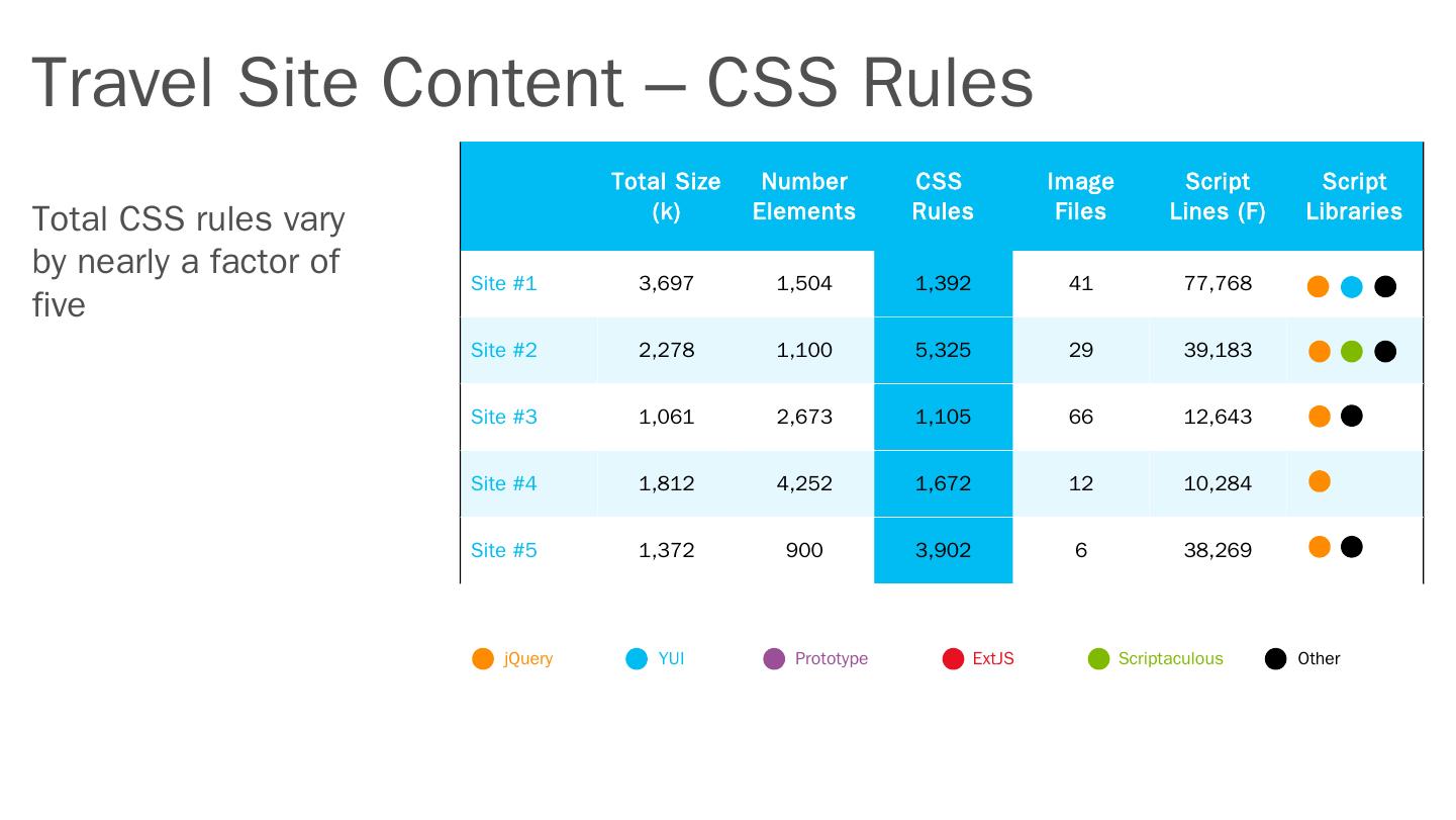 10 .Total CSS rules vary by nearly a factor of five Travel Site Content – CSS Rules Total Size (k) Number Elements CSS Rules Image Files Script Lines (F) Script Libraries Site #1 3,697 1,504 1,392 41 77,768 Site #2 2,278 1,100 5,325 29 39,183 Site #3 1,061 2,673 1,105 66 12,643 Site #4 1,812 4,252 1,672 12 10,284 Site #5 1,372 900 3,902 6 38,269 YUI jQuery Prototype ExtJS Other Scriptaculous