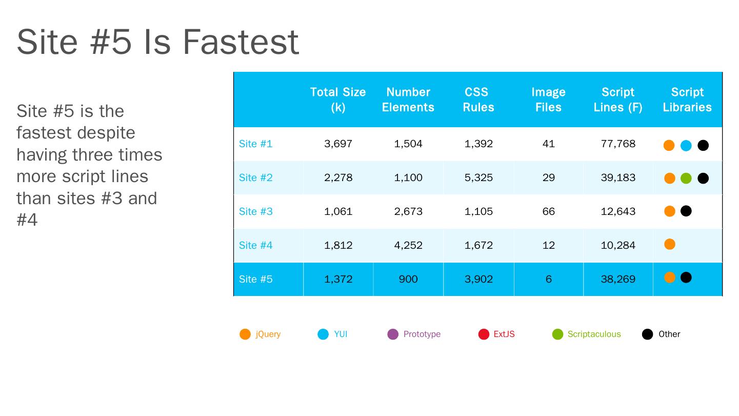 17 .Site #2 is the slowest despite having relatively low number of elements and staying in the middle of the pack on the other metrics. Site #2 is Slowest Total Size (k) Number Elements CSS Rules Image Files Script Lines (F) Script Libraries Site #1 3,697 1,504 1,392 41 77,768 Site #2 2,278 1,100 5,325 29 39,183 Site #3 1,061 2,673 1,105 66 12,643 Site #4 1,812 4,252 1,672 12 10,284 Site #5 1,372 900 3,902 6 38,269 YUI jQuery Prototype ExtJS Other Scriptaculous