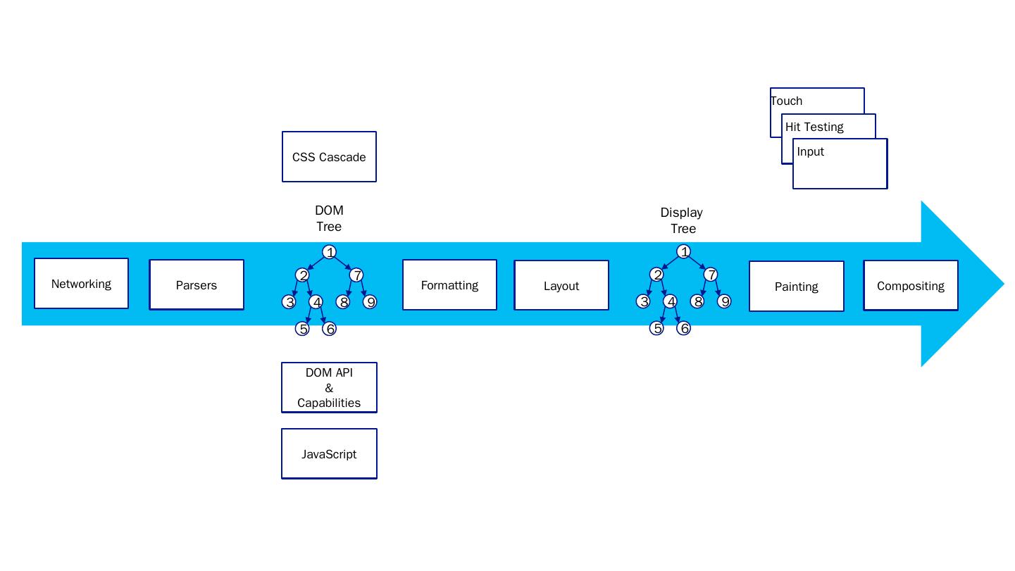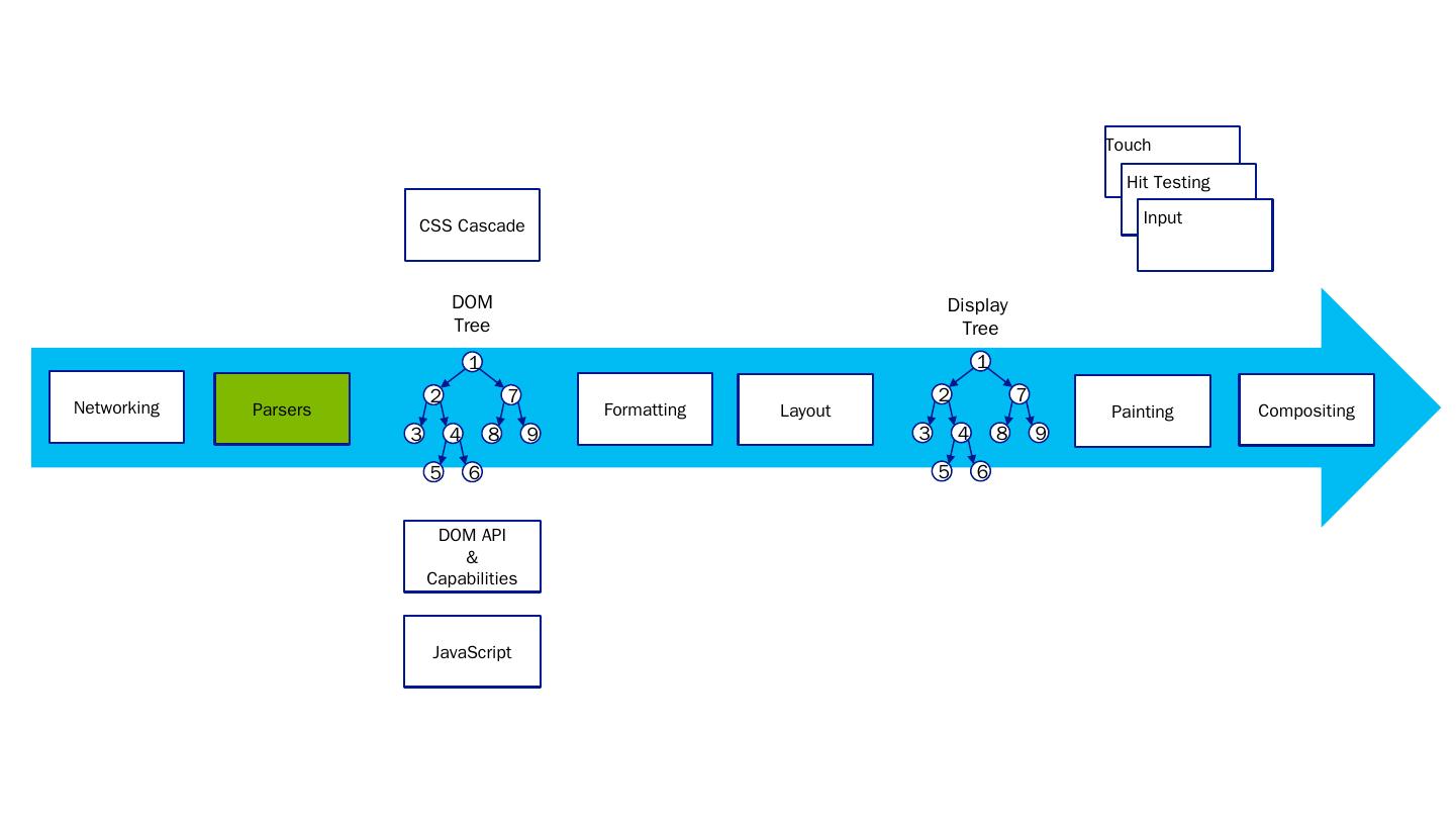 25 .Networking Parsers 1 2 7 4 3 8 9 5 6 DOM Tree Formatting Layout Painting 1 2 7 4 3 8 9 5 6 Display Tree Compositing DOM API & Capabilities JavaScript Touch Hit Testing Input CSS Cascade
