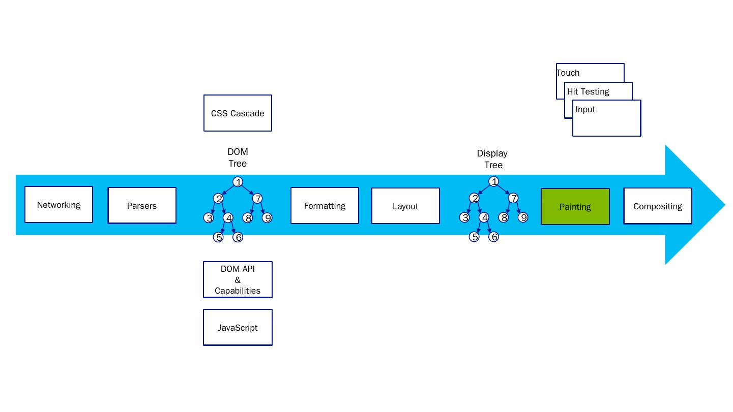 22 .Networking Parsers 1 2 7 4 3 8 9 5 6 DOM Tree Formatting Layout Painting 1 2 7 4 3 8 9 5 6 Display Tree Compositing DOM API & Capabilities JavaScript Touch Hit Testing Input CSS Cascade
