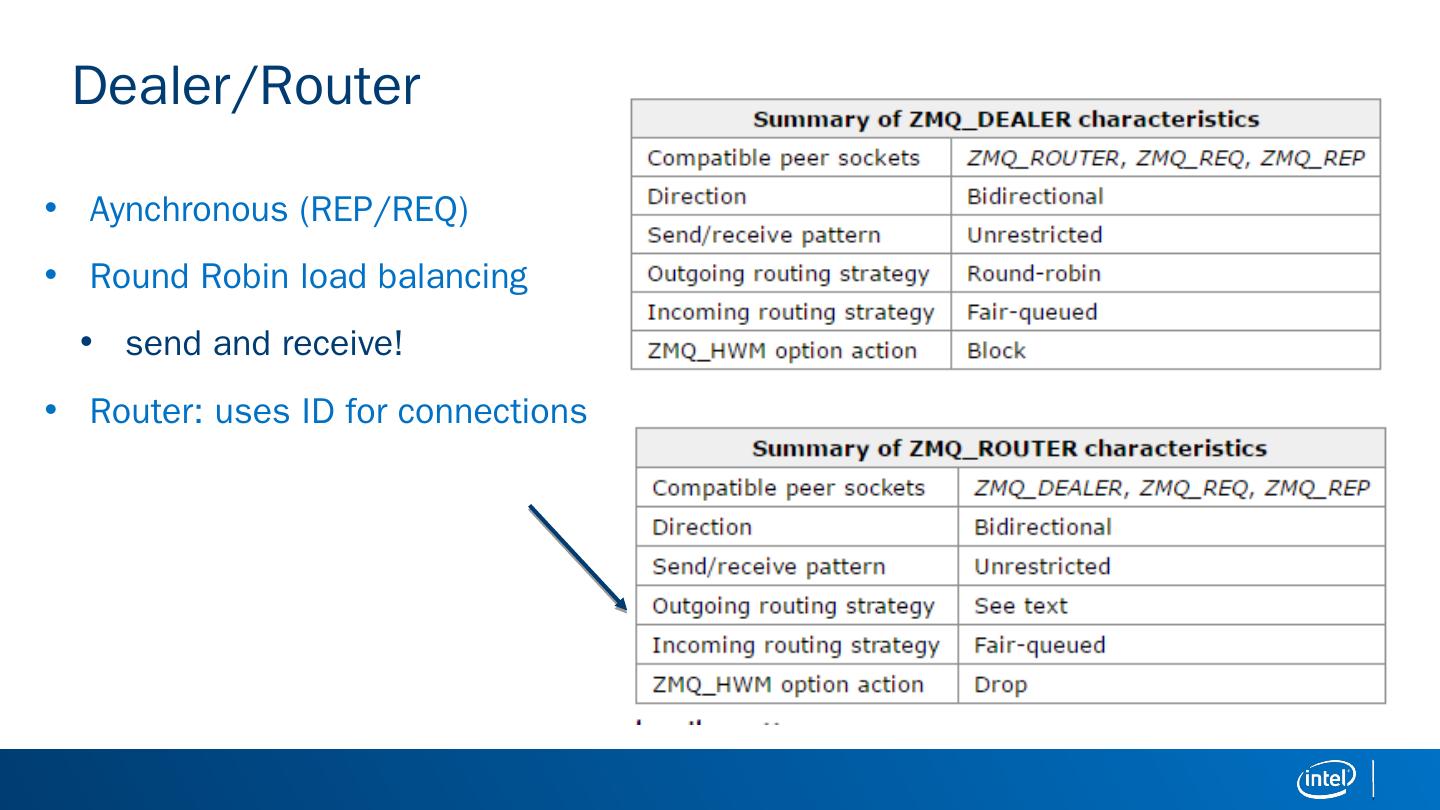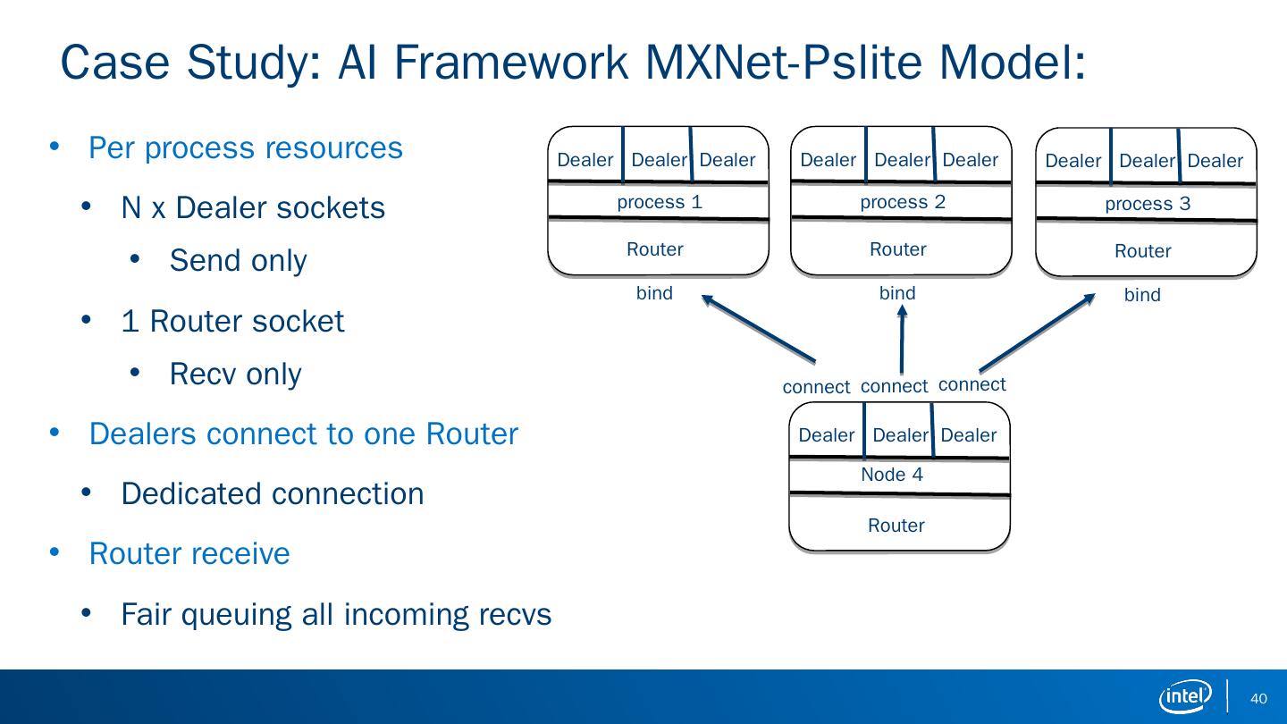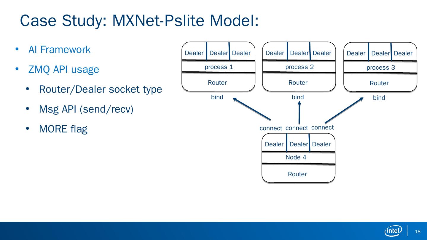 Case Study: MXNet-Pslite Model: AI Framework; ZMQ API usage. Router/Dealer socket type; Msg API (send/recv); MORE flag. Router. Dealer Dealer Dealer.