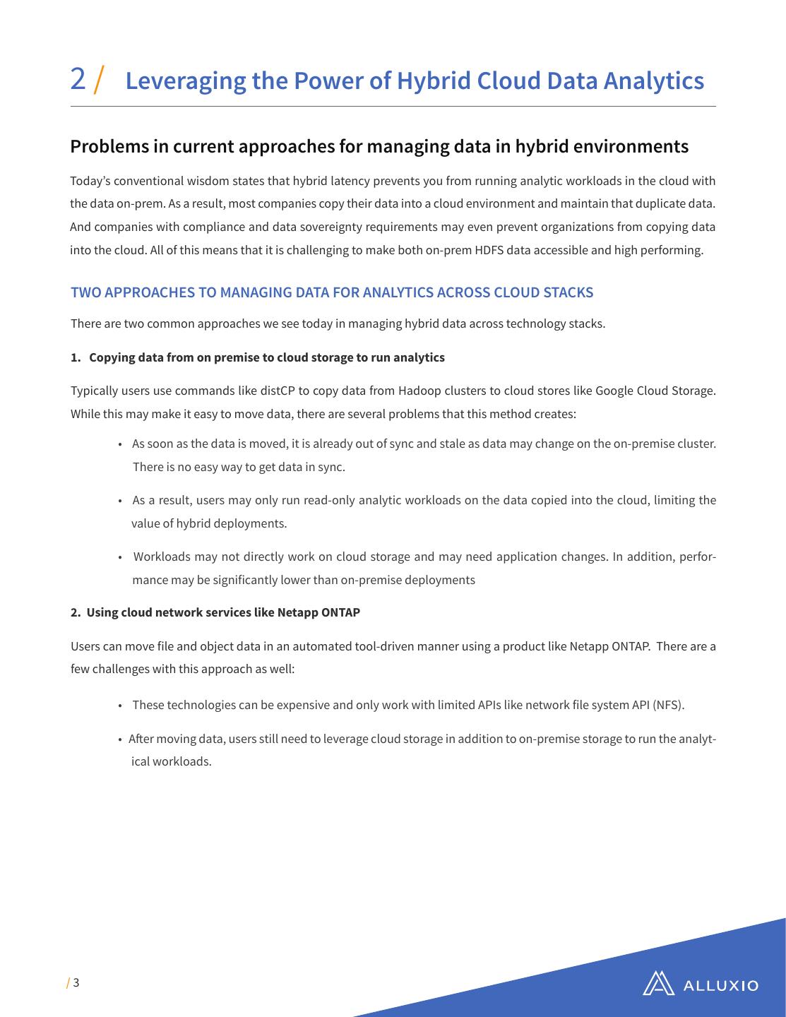 3 .2/ Leveraging the Power of Hybrid Cloud Data Analytics Problems in current approaches for managing data in hybrid environments Today’s conventional wisdom states that hybrid latency prevents you from running analytic workloads in the cloud with the data on-prem. As a result, most companies copy their data into a cloud environment and maintain that duplicate data. And companies with compliance and data sovereignty requirements may even prevent organizations from copying data into the cloud. All of this means that it is challenging to make both on-prem HDFS data accessible and high performing. TWO APPROACHES TO MANAGING DATA FOR ANALYTICS ACROSS CLOUD STACKS There are two common approaches we see today in managing hybrid data across technology stacks. 1. Copying data from on premise to cloud storage to run analytics Typically users use commands like distCP to copy data from Hadoop clusters to cloud stores like Google Cloud Storage. While this may make it easy to move data, there are several problems that this method creates: • As soon as the data is moved, it is already out of sync and stale as data may change on the on-premise cluster. There is no easy way to get data in sync. • As a result, users may only run read-only analytic workloads on the data copied into the cloud, limiting the value of hybrid deployments. • Workloads may not directly work on cloud storage and may need application changes. In addition, perfor- mance may be significantly lower than on-premise deployments 2. Using cloud network services like Netapp ONTAP Users can move file and object data in an automated tool-driven manner using a product like Netapp ONTAP. There are a few challenges with this approach as well: • These technologies can be expensive and only work with limited APIs like network file system API (NFS). • After moving data, users still need to leverage cloud storage in addition to on-premise storage to run the analyt- ical workloads. /3