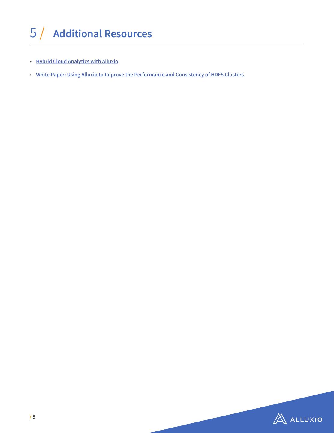 8 .5/ Additional Resources • Hybrid Cloud Analytics with Alluxio • White Paper: Using Alluxio to Improve the Performance and Consistency of HDFS Clusters /8