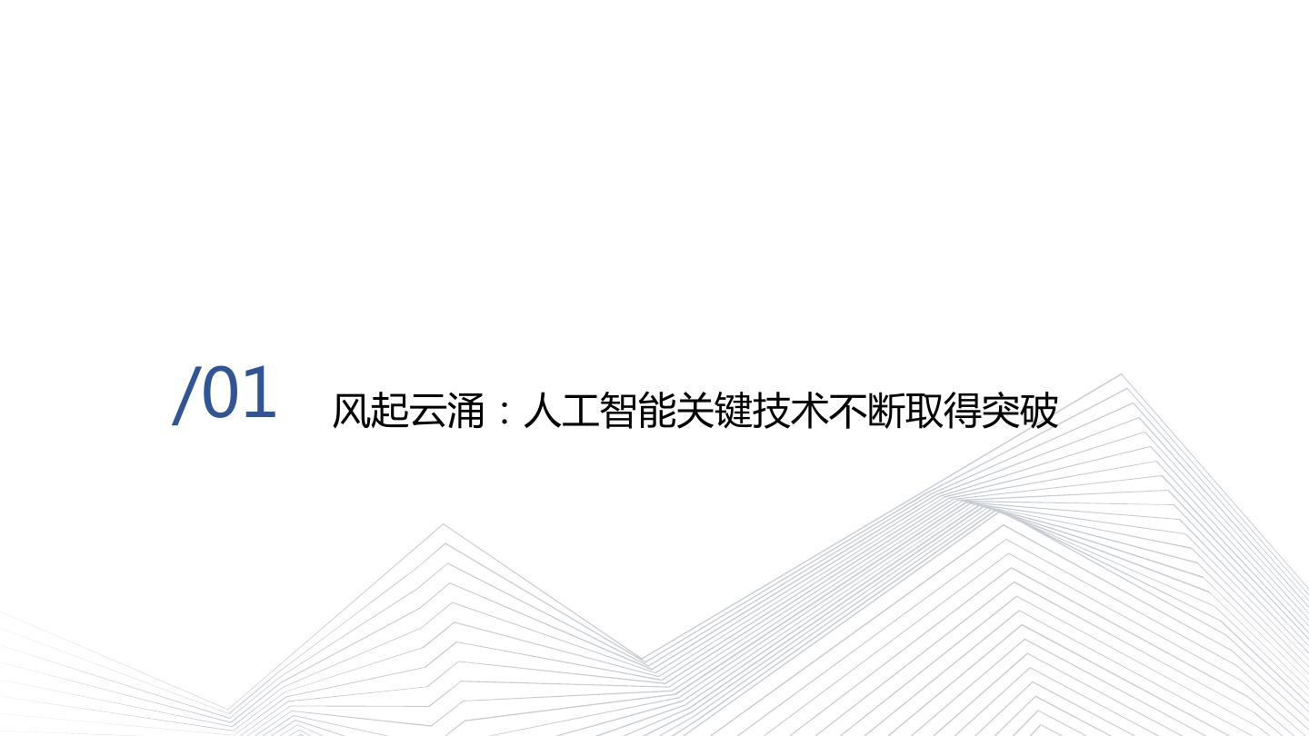 2 .目 录 01 风中云涌m人工智能关会技术u断取得突破 02 相得益决m人工智能赋能产zv应用场景 03 百川归海m人工智能开放创新平台亮步建立 04 各领风骚m全球人工智能公司一览