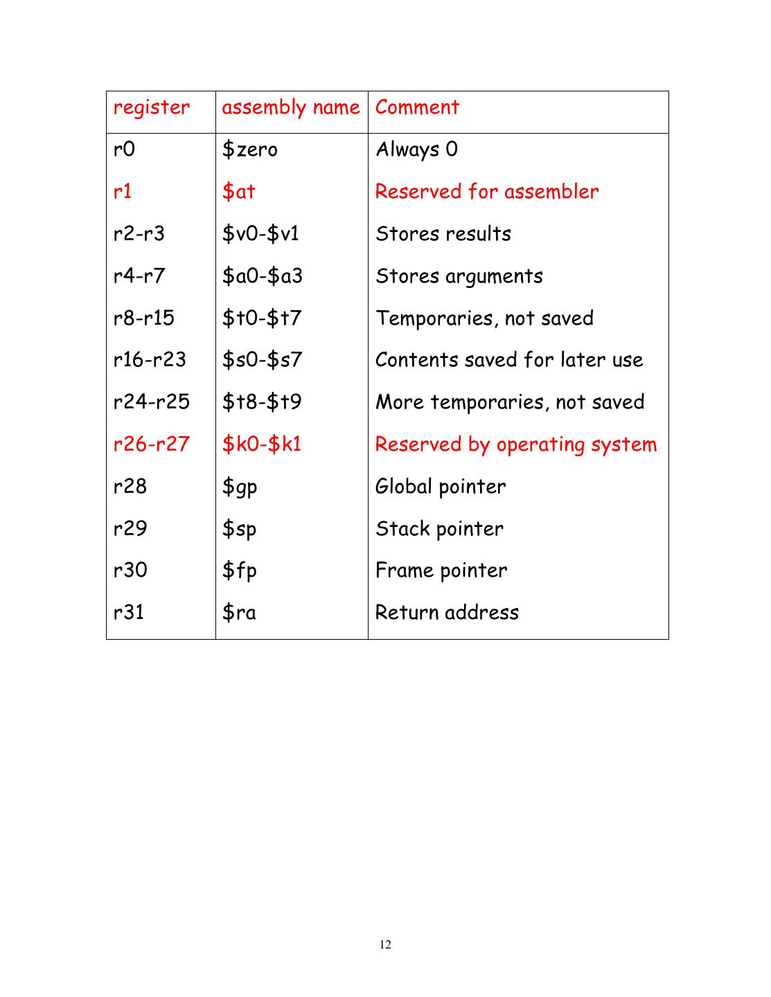 12 .register assembly name Comment r0 $zero Always 0 r1 $at Reserved for assembler r2-r3 $v0-$v1 Stores results r4-r7 $a0-$a3 Stores arguments r8-r15 $t0-$t7 Temporaries, not saved r16-r23 $s0-$s7 Contents saved for later use r24-r25 $t8-$t9 More temporaries, not saved r26-r27 $k0-$k1 Reserved by operating system r28 $gp Global pointer r29 $sp Stack pointer r30 $fp Frame pointer r31 $ra Return address 12