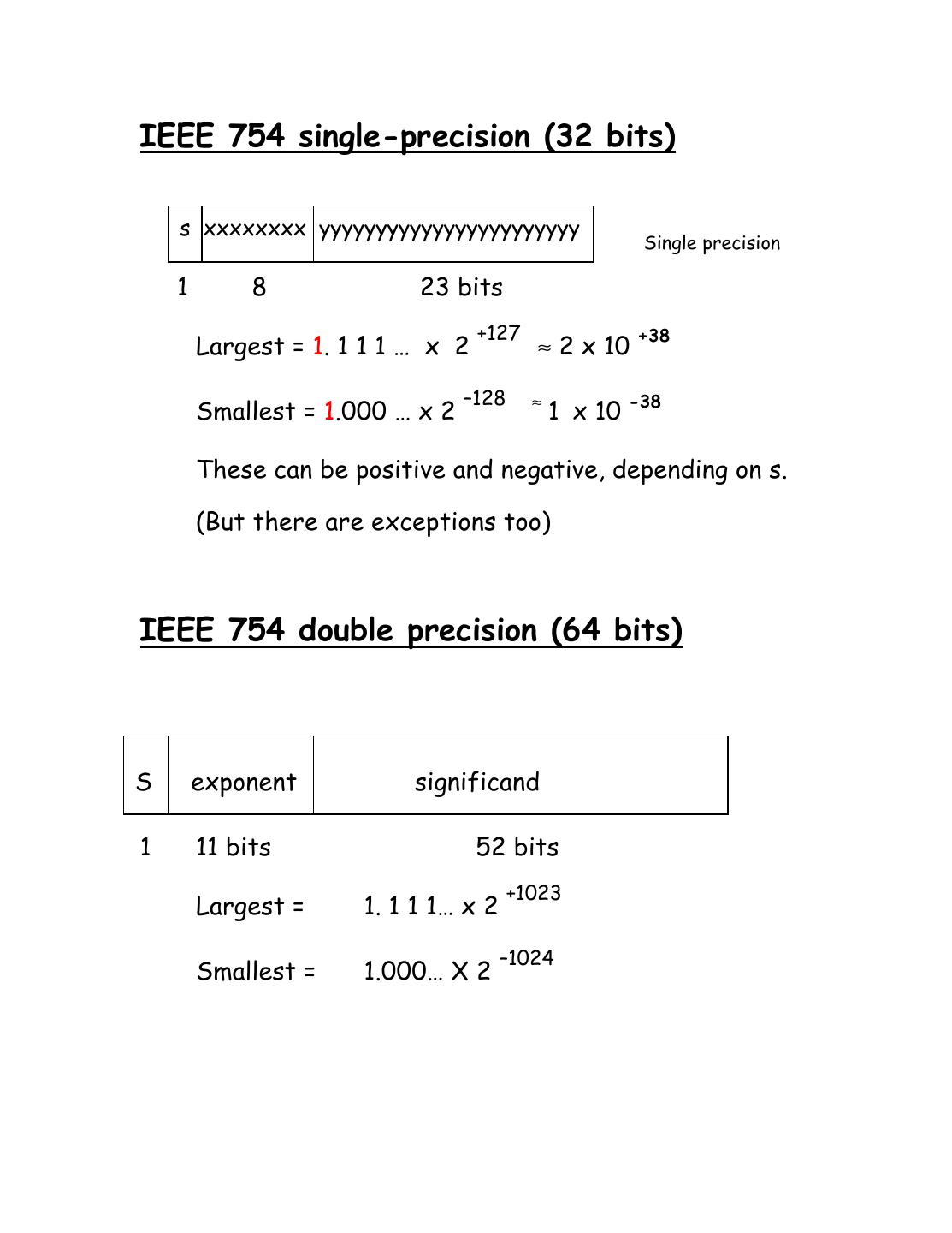 2 .IEEE 754 single-precision (32 bits) s xxxxxxxx yyyyyyyyyyyyyyyyyyyyyyy Single precision 1 8 23 bits +127 +38 Largest = 1. 1 1 1 … x 2 ≈ 2 x 10 –128 ≈ -38 Smallest = 1.000 … x 2 1 x 10 These can be positive and negative, depending on s. (But there are exceptions too) IEEE 754 double precision (64 bits) S exponent significand 1 11 bits 52 bits +1023 Largest = 1. 1 1 1… x 2 –1024 Smallest = 1.000… X 2