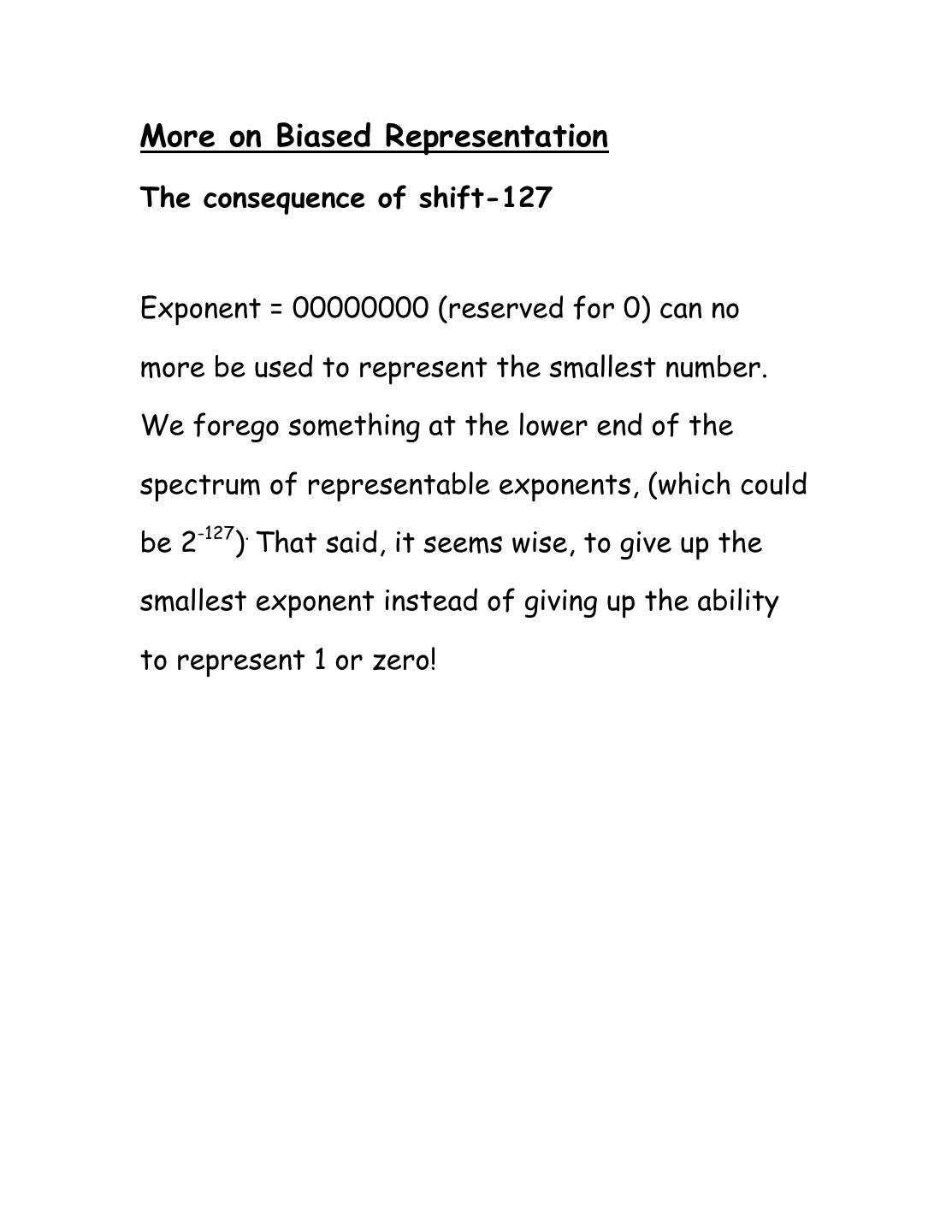 5 .More on Biased Representation The consequence of shift-127 Exponent = 00000000 (reserved for 0) can no more be used to represent the smallest number. We forego something at the lower end of the spectrum of representable exponents, (which could be 2-127). That said, it seems wise, to give up the smallest exponent instead of giving up the ability to represent 1 or zero!