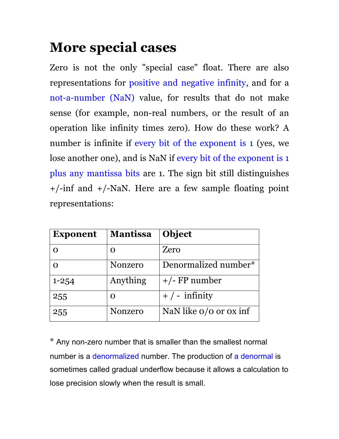 6 .More special cases Zero is not the only "special case" float. There are also representations for positive and negative infinity, and for a not-a-number (NaN) value, for results that do not make sense (for example, non-real numbers, or the result of an operation like infinity times zero). How do these work? A number is infinite if every bit of the exponent is 1 (yes, we lose another one), and is NaN if every bit of the exponent is 1 plus any mantissa bits are 1. The sign bit still distinguishes +/-inf and +/-NaN. Here are a few sample floating point representations: Exponent Mantissa Object 0 0 Zero 0 Nonzero Denormalized number* 1-254 Anything +/- FP number 255 0 + / - infinity 255 Nonzero NaN like 0/0 or 0x inf * Any non-zero number that is smaller than the smallest normal number is a denormalized number. The production of a denormal is sometimes called gradual underflow because it allows a calculation to lose precision slowly when the result is small.