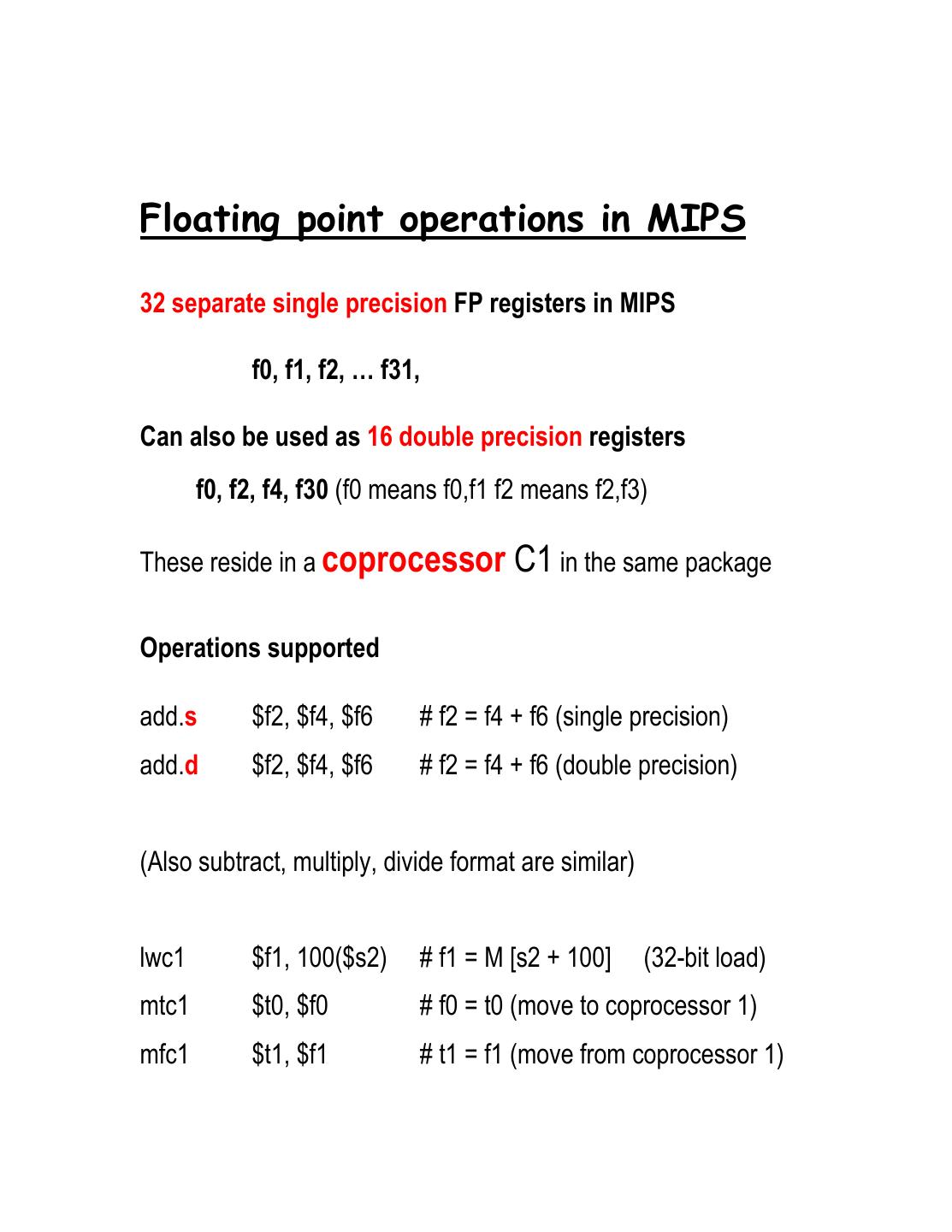 7 .Floating point operations in MIPS 32 separate single precision FP registers in MIPS f0, f1, f2, … f31, Can also be used as 16 double precision registers f0, f2, f4, f30 (f0 means f0,f1 f2 means f2,f3) These reside in a coprocessor C1 in the same package Operations supported add.s $f2, $f4, $f6 # f2 = f4 + f6 (single precision) add.d $f2, $f4, $f6 # f2 = f4 + f6 (double precision) (Also subtract, multiply, divide format are similar) lwc1 $f1, 100($s2) # f1 = M [s2 + 100] (32-bit load) mtc1 $t0, $f0 # f0 = t0 (move to coprocessor 1) mfc1 $t1, $f1 # t1 = f1 (move from coprocessor 1)