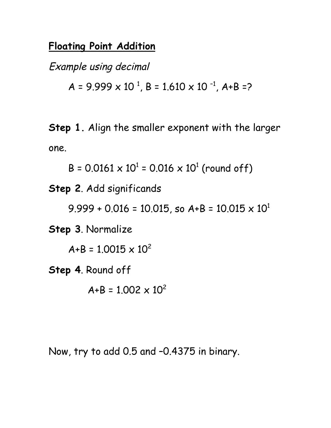 9 .Floating Point Addition Example using decimal A = 9.999 x 10 1, B = 1.610 x 10 –1, A+B =? Step 1. Align the smaller exponent with the larger one. B = 0.0161 x 101 = 0.016 x 101 (round off) Step 2. Add significands 9.999 + 0.016 = 10.015, so A+B = 10.015 x 101 Step 3. Normalize A+B = 1.0015 x 102 Step 4. Round off A+B = 1.002 x 102 Now, try to add 0.5 and –0.4375 in binary.