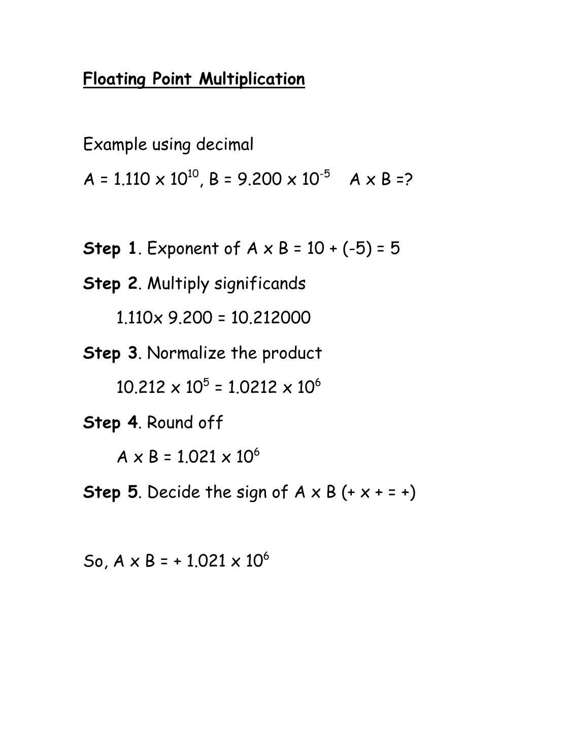 10 .Floating Point Multiplication Example using decimal A = 1.110 x 1010, B = 9.200 x 10-5 A x B =? Step 1. Exponent of A x B = 10 + (-5) = 5 Step 2. Multiply significands 1.110x 9.200 = 10.212000 Step 3. Normalize the product 10.212 x 105 = 1.0212 x 106 Step 4. Round off A x B = 1.021 x 106 Step 5. Decide the sign of A x B (+ x + = +) So, A x B = + 1.021 x 106