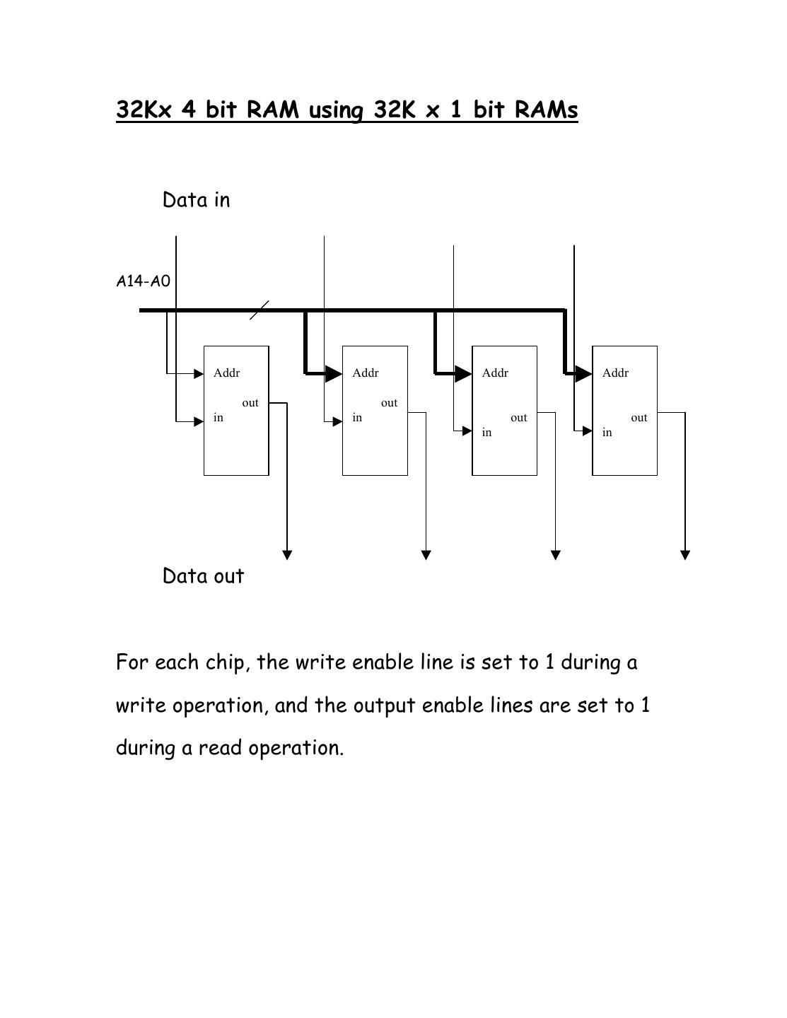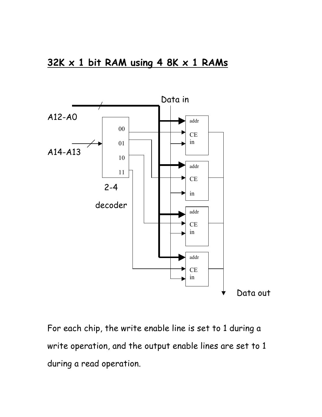 6 .32K x 1 bit RAM using 4 8K x 1 RAMs Data in A12-A0 addr 00 CE 01 in A14-A13 10 addr 11 CE 2-4 in decoder addr CE in addr CE in Data out For each chip, the write enable line is set to 1 during a write operation, and the output enable lines are set to 1 during a read operation.