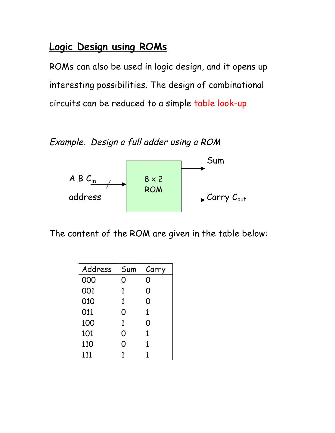 10 .Logic Design using ROMs ROMs can also be used in logic design, and it opens up interesting possibilities. The design of combinational circuits can be reduced to a simple table look-up Example. Design a full adder using a ROM Sum A B Cin 8x2 ROM address Carry Cout The content of the ROM are given in the table below: Address Sum Carry 000 0 0 001 1 0 010 1 0 011 0 1 100 1 0 101 0 1 110 0 1 111 1 1