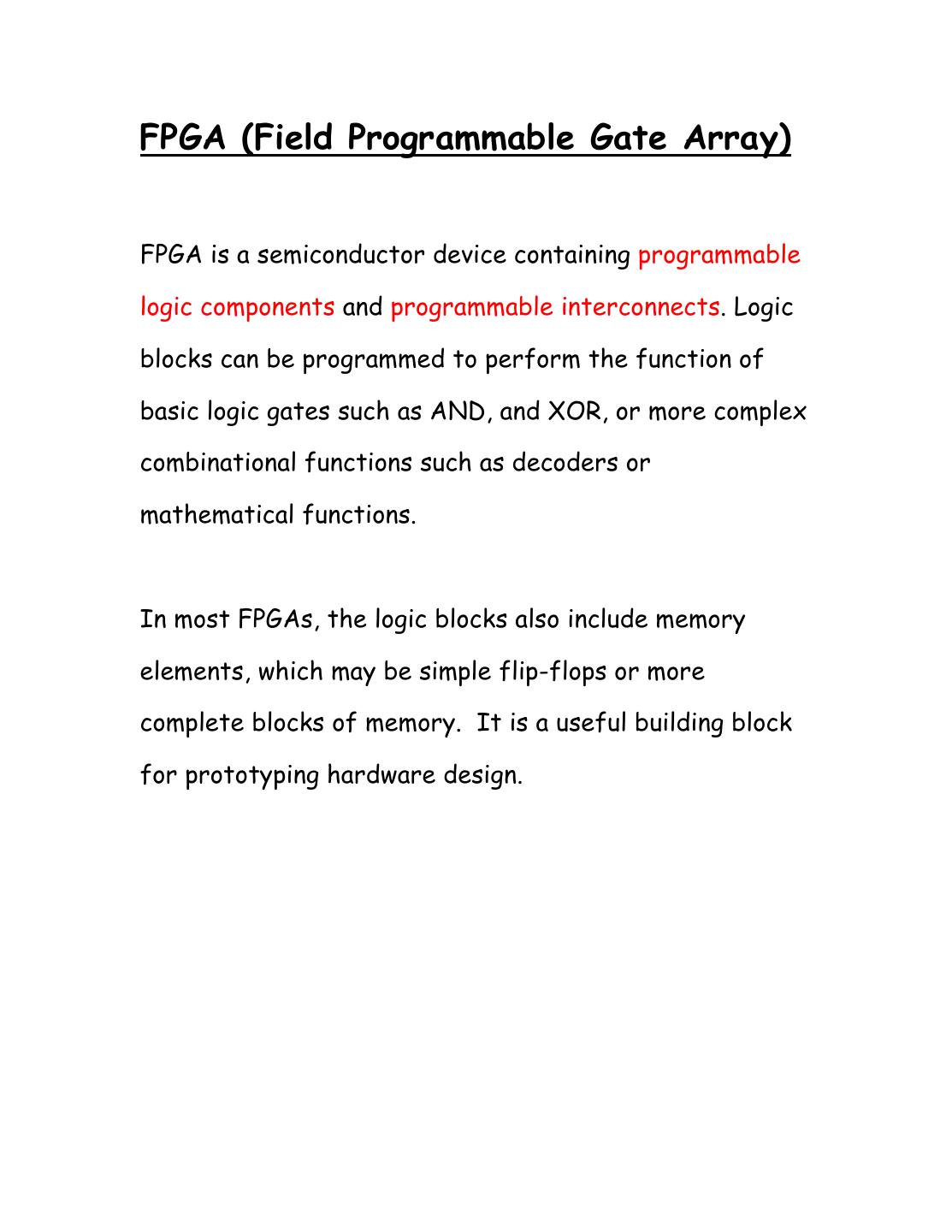 11 .FPGA (Field Programmable Gate Array) FPGA is a semiconductor device containing programmable logic components and programmable interconnects. Logic blocks can be programmed to perform the function of basic logic gates such as AND, and XOR, or more complex combinational functions such as decoders or mathematical functions. In most FPGAs, the logic blocks also include memory elements, which may be simple flip-flops or more complete blocks of memory. It is a useful building block for prototyping hardware design.